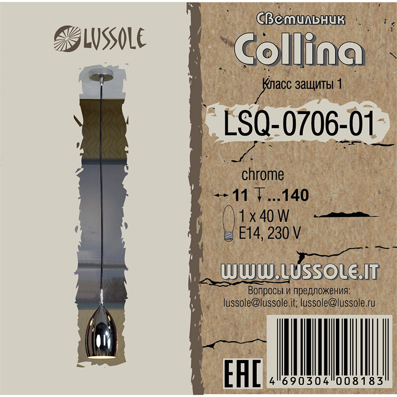 Подвесной светильник Collina - продукт известной компании Lussole (Италия). Имеет максимальную мощность 40 Вт, освещает площадь до 2 кв. м. Отлично подойдет для таких мест, как кафе, кухня, прихожая и коридор. Впишется в интерьеры следующих стилей: модерн.