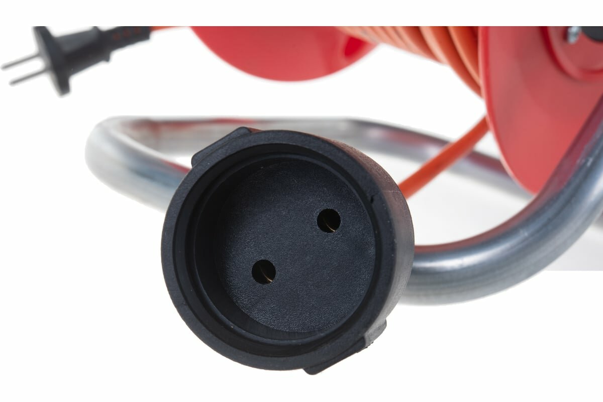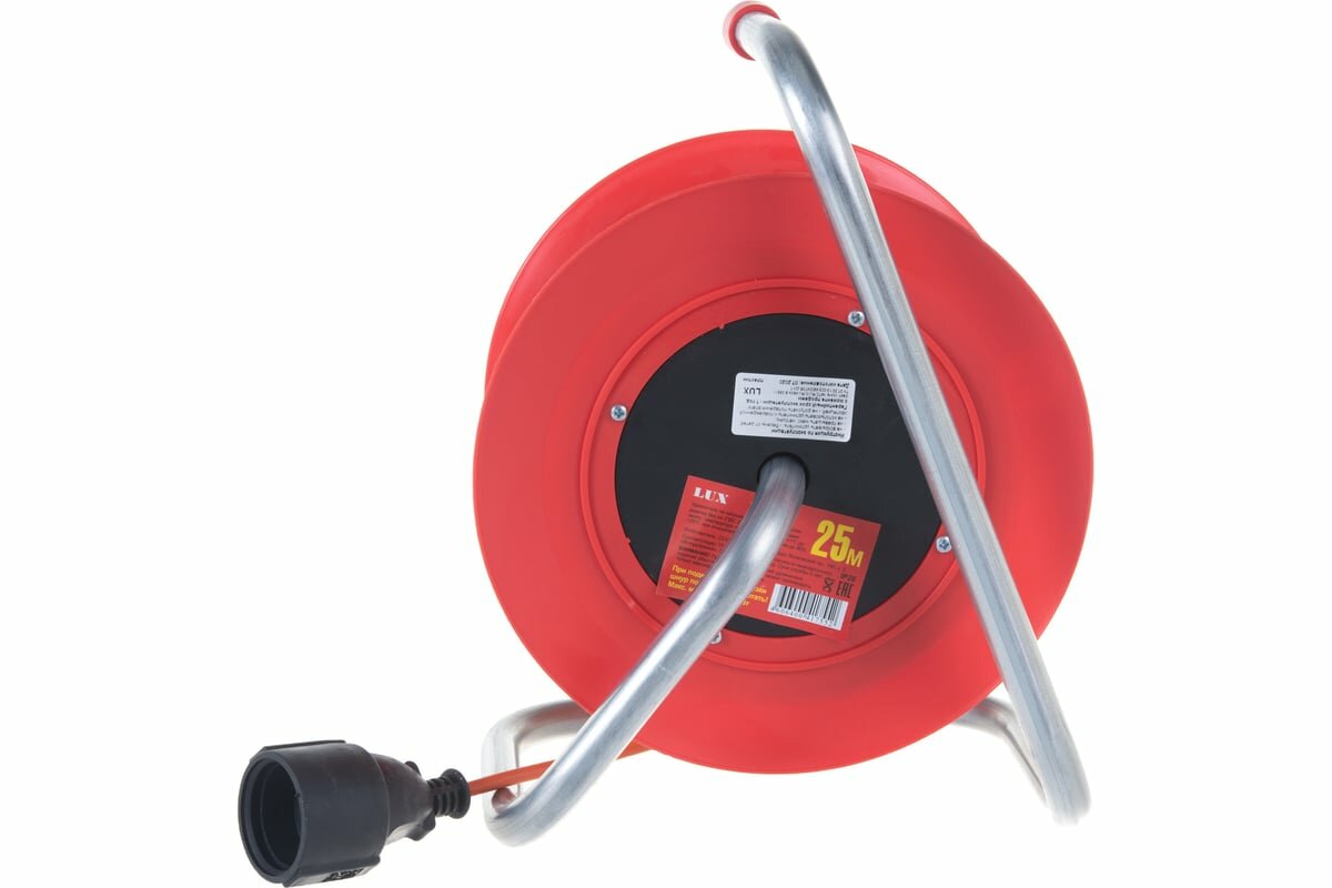 Lux Удлинитель силовой на катушке ПВС 2x0.75 выносная розетка б/з 25 м Силовой удлинитель на катушке служит для присоединения электрических прибор, которые находятся на удалении от основного источника сети. Провод находится на катушке с выносной розеткой, что позволяет компактно хранить и без труда транспортировать удлинитель. Провод ПВС 2х075. Длина провода составляет 25 метров.