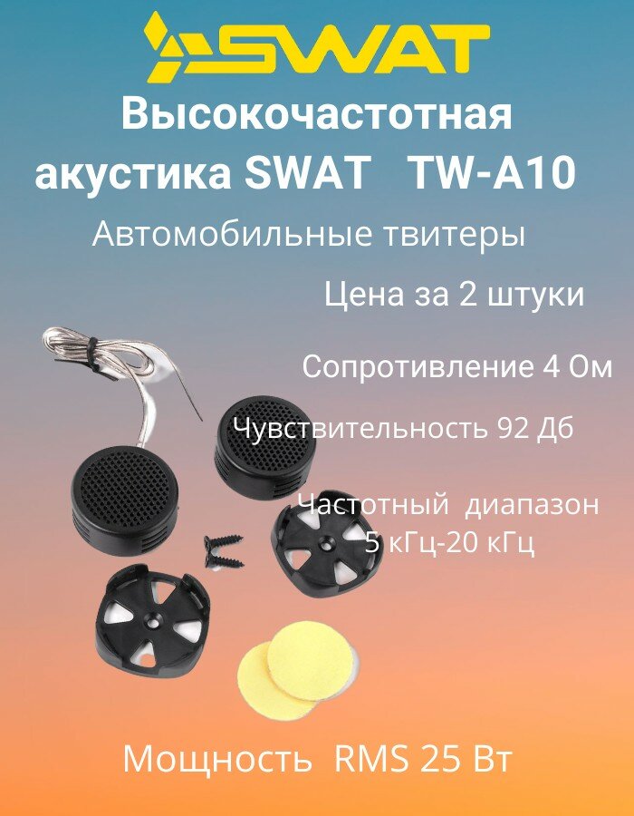 Автомобильные колонки Swat , максимальная мощность 250 Вт, размер динамика 2.5 см (1 дюйм), твитер, однополосные, чувствительность 97дБ, импеданс 4Ом (SWAT )