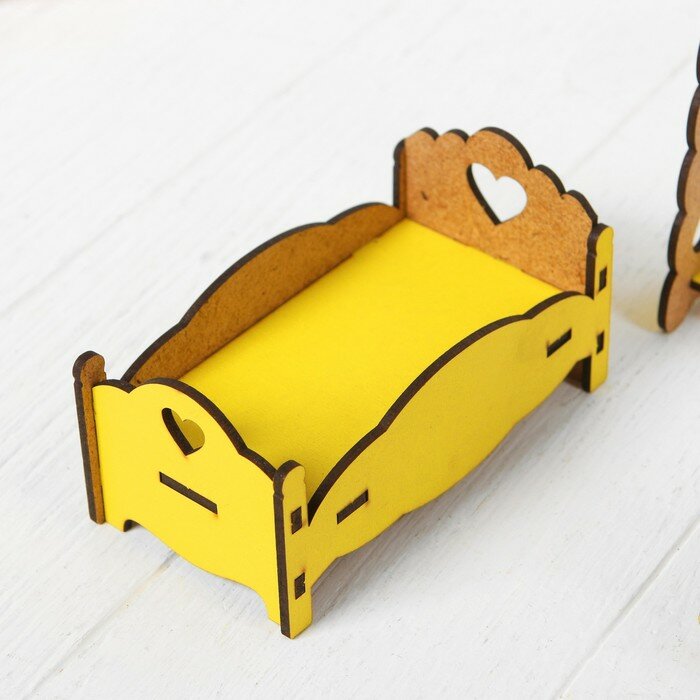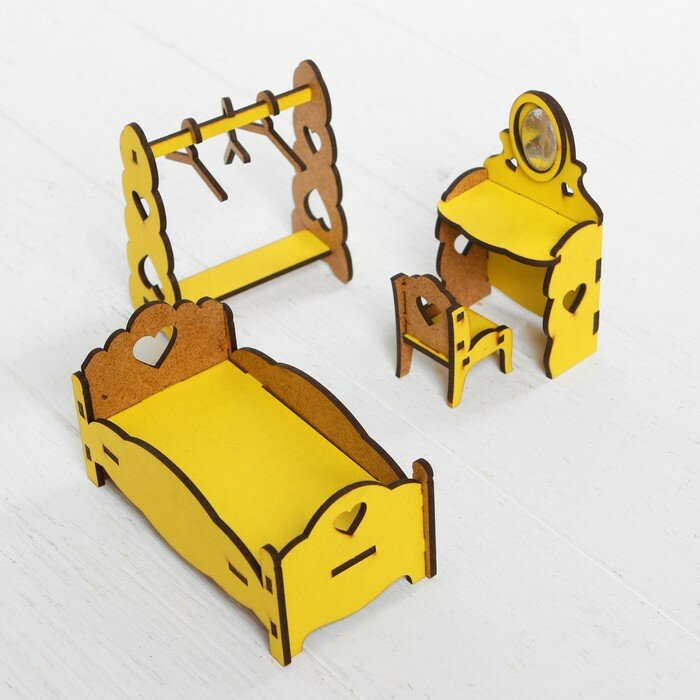 Набор включает в себя самые необходимые предметы: столик с зеркалом и стульчиком, уютную кроватку и вешалочку для одежды. Подходит для небольших куколок ростом до 12 см. Вся мебель из набора состоит из деревянных деталей и собирается как конструктор. В комплекте находятся необходимые элементы и схематичная инструкция. При сборке мебели развивается мелкая моторика рук, а при игре — воображение и фантазия ребенка.