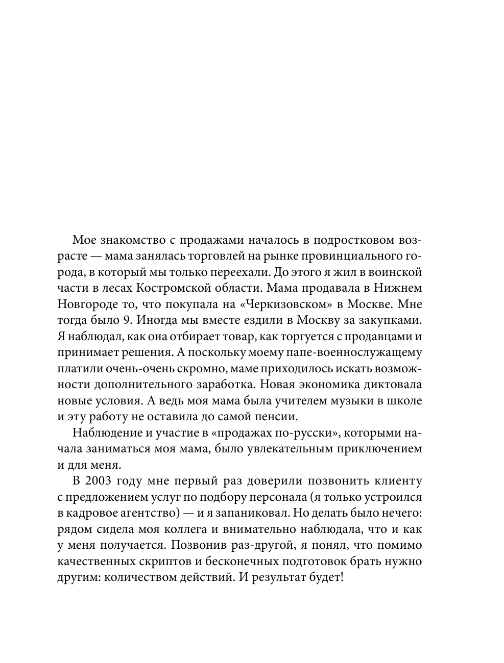 С помощью этой книги читатель сможет научиться продавать по телефону, при реальной встрече, и даже в мессенджерах! Полезные лайфхаки, бонусы, техники описаны достаточно просто, что мне лично пришлось по душе. Думаю, что даже опытным продавцам есть чему поучиться у Владимира. -