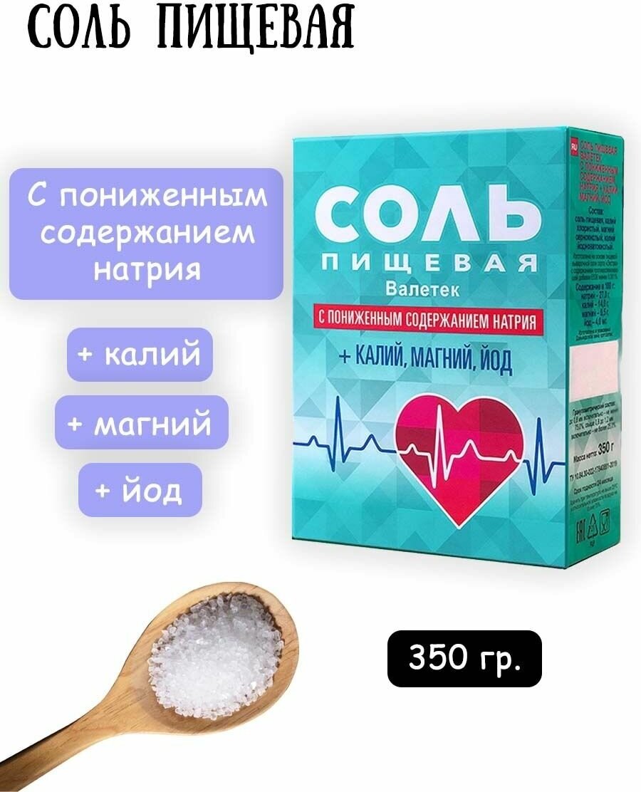В соли пищевой с пониженным содержанием натрия + калий, магний, йод 30 % хлорида натрия заменены на соли калия и магния. Дополнительно соль обогащена высокостабильным соединением йода.