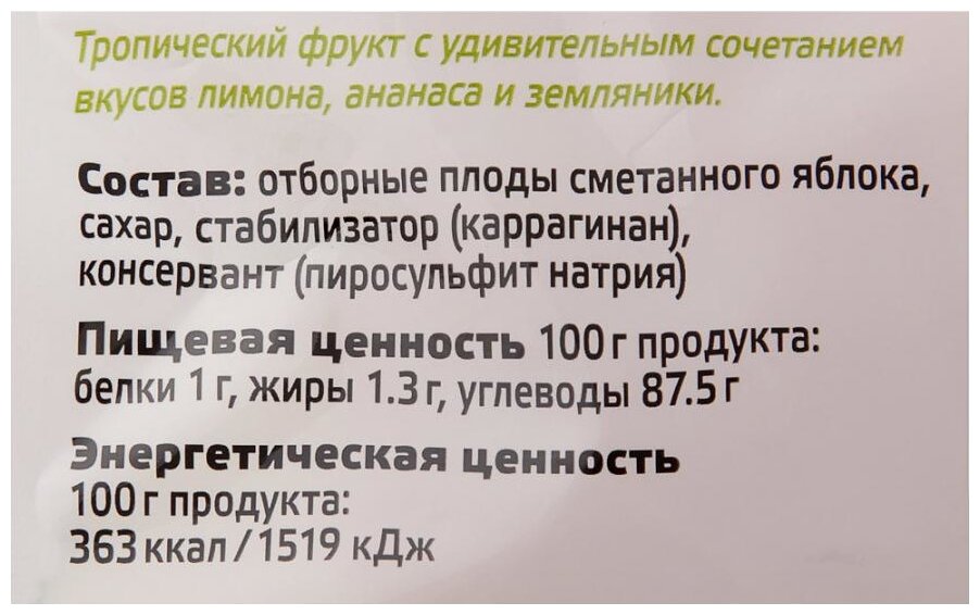 | Состав | Отборные плоды сметанного яблока, сахар, стабилизатор - каррагинан, консервант - пиросульфит натрия |