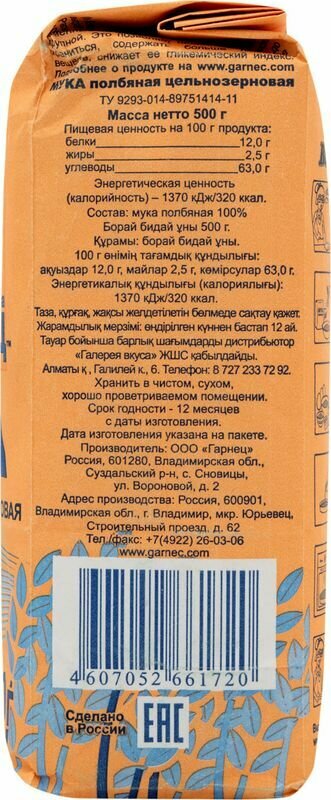 Мука Гарнец Полбяная цельнозерновая 500г