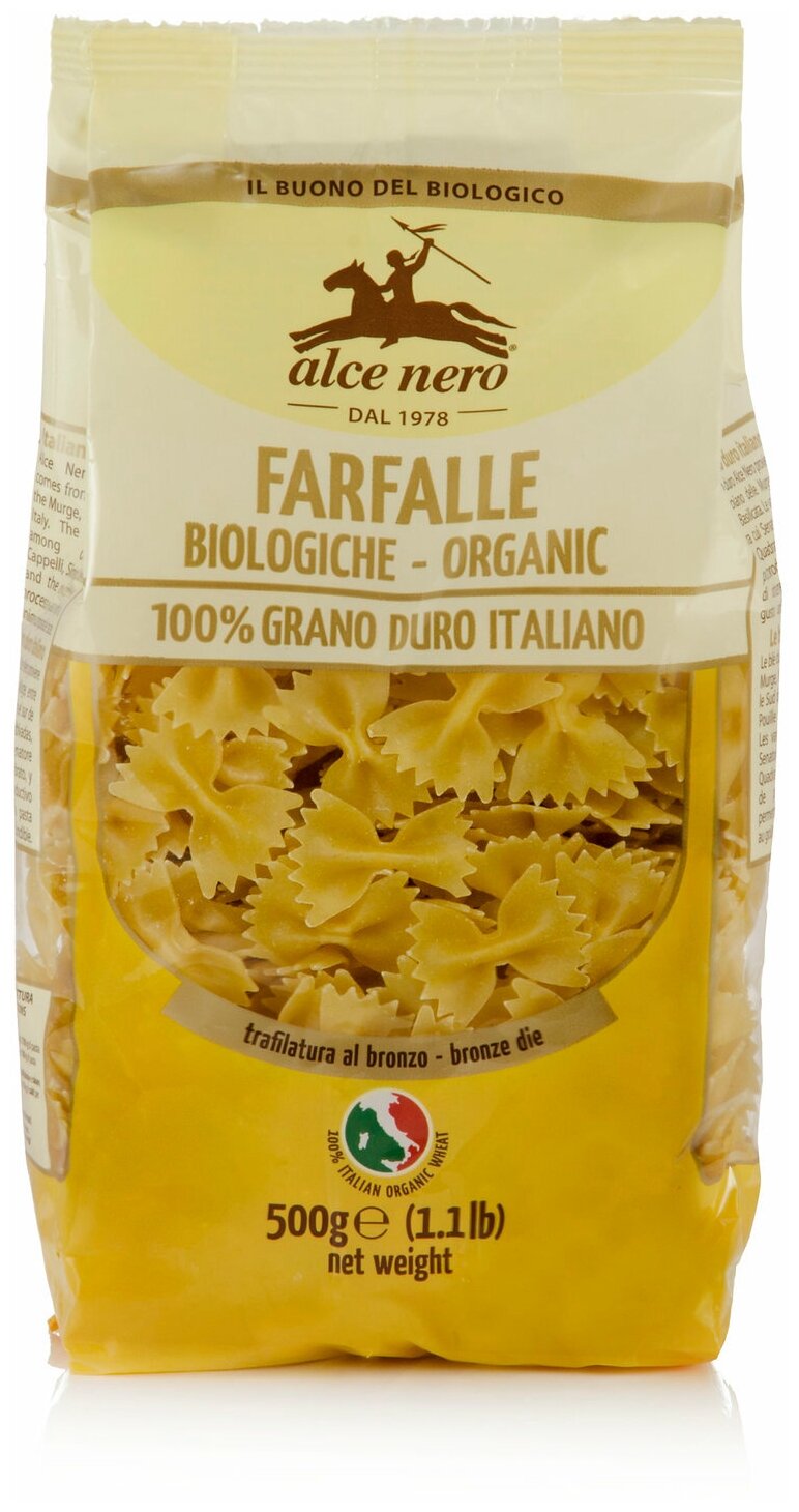 Макароны Alce Nero Farfalle Biologici-Organic 500г - это органический итальянский продукт, который производится из твердых сортов пшеницы (Senatore Cappelli, Simeto и Quadrato), выращенной без использования химии и пестицидов, и чистой родниковой воды из Доломитовых Альп. Для формования макаронных изделий используется экструзия (продавливание) сквозь специальные бронзовые штампы. Благодаря этому старинному способу поверхность макарон получается шероховатой и отлично впитывает соусы любой консистенции. Farfalle - короткие фигурные макароны, выполненные в форме бантиков (бабочек). Можно подавать с густыми мясными и сливочными соусами, использовать для приготовления салатов.