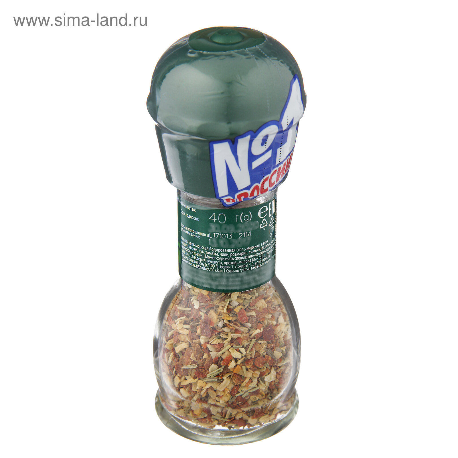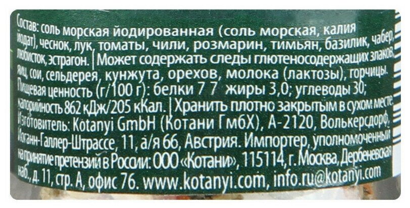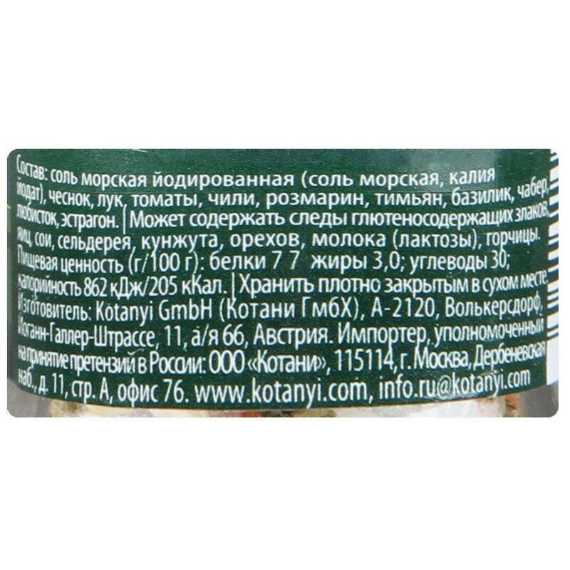 | Состав | соль морская йодированная (соль морская, калия йодат), чеснок, лук, томаты, чили, розмарин, тимьян, базилик, чабер, любисток, эстрагон. |