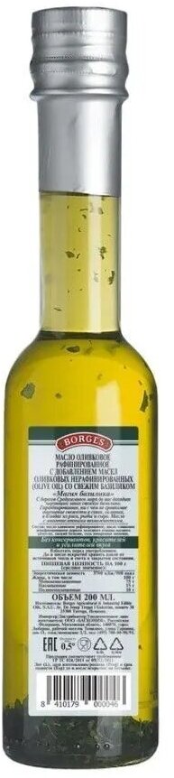 | Состав | Масло оливковое рафинированное и масло оливковое нерафинированное первого холодного отжима высшего качества, свежий базилик, соль поваренная пищевая. |