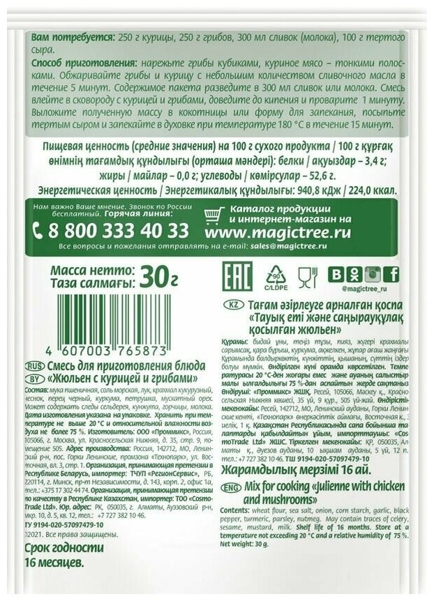 Жюльен — традиционная горячая закуска французской кухни из запеченного с грибами куриного филе под хрустящей сырной шапкой. Смесь соли, чеснока, черного перца, петрушки и мускатного ореха подарит уже полюбившемуся всем блюду неповторимый аромат и пряный вкус. Смесь для жульена с курицей и грибами бренда «Волшебное Дерево» облегчит приготовление вкусного и ароматного блюда, отличающегося уникальным сочетанием вкусов и текстур, создавая баланс между нежностью грибов и пикантностью специй.