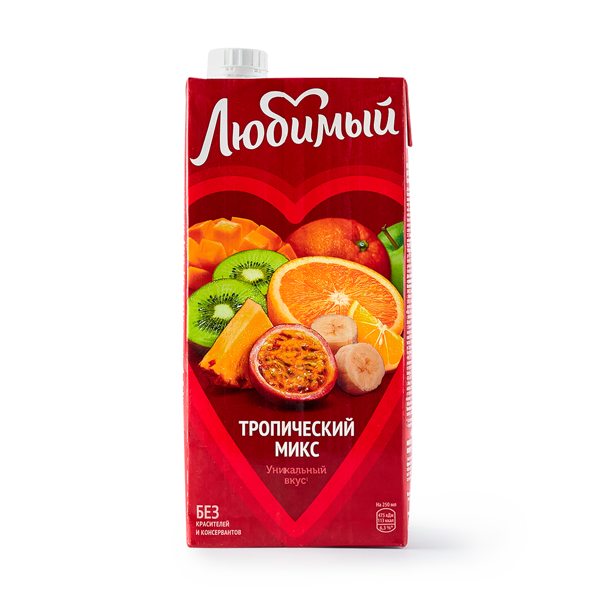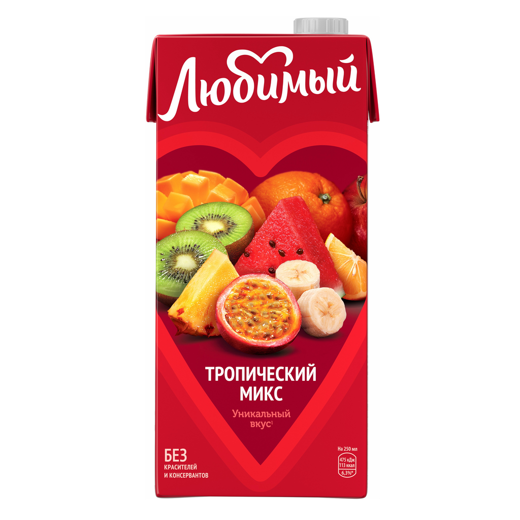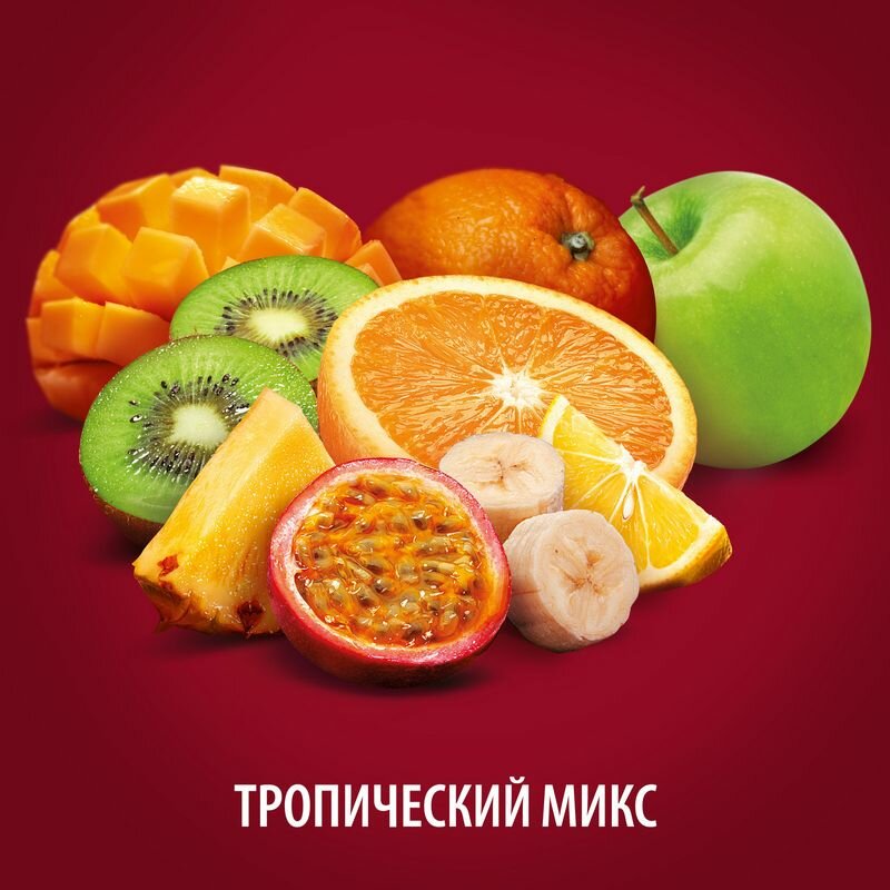 | Состав | Яблочный сок, апельсиновый сок, ананасовый сок, арбузный сок, банановое пюре, лимонный сок, пюре из манго, сок из киви, сок из маракуйи, сахар и глюкозно-фруктозный сироп, β-каротин, регулятор кислотности - лимонная кислота, вода. Изготовлен из концентрированных соков и пюре. Минимальная объемная доля сока и пюре - 35% |