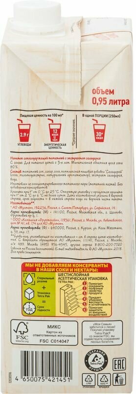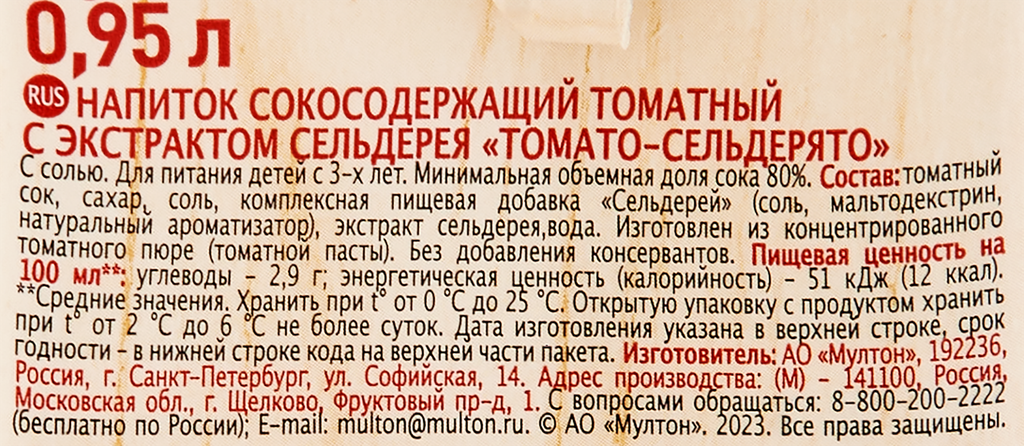 | Состав | Томатный сок, сахар, соль, комплексная пищевая добавка "Сельдерей" (соль, мальтодекстрин, натуральный ароматизатор), экстракт сельдерея,вода. Изготовлен из концентрированного томатного пюре (томатной пасты) |