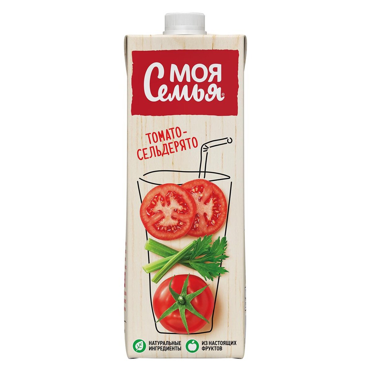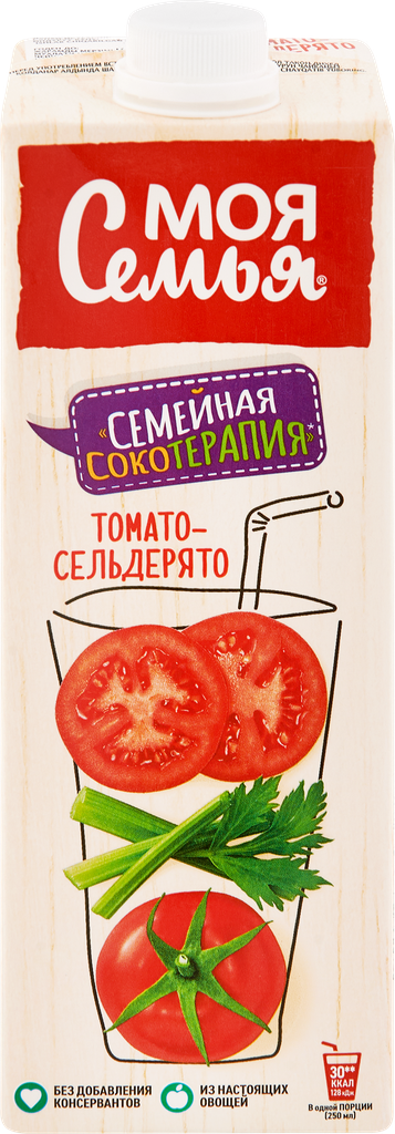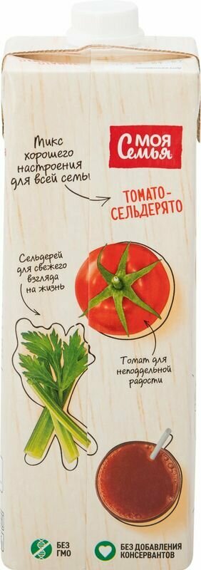 Вкусное сочетание спелого красного томата и душистого сельдерея придает неповторимый вкус напитку Моя Семья "Томато-Сельдерято". Продукт не содержит ГМО, произведен из настоящих овощей без добавления консервантов. Упаковка продукта может быть в цветном или белом виде.