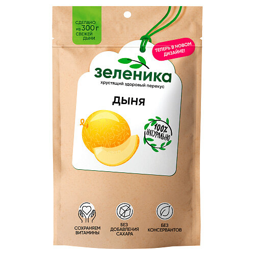 Дыня Зеленика здоровый фруктовый перекус 20г - это хрустящие снеки, приготовленные по особой технологии из свежих отборных плодов. Вакуумная дегидрация вытягивает из спелой сочной дыни всю влагу, за счет чего она теряет свой вес и объем, но сохраняет натуральный вкус, цвет, вид и до 90% питательной ценности и полезных веществ. Из 200г свежей дыни получается 20г хрустящей с практически таким же количеством витаминов, микроэлементов и органических кислот. Продукт не содержит сахара, консервантов, искусственных добавок и ГМО. Подходит для вегетарианского, постного и диетического питания. Чтобы снеки сохранили свою хрустящую структуру, рекомендуется употребить их в течение 1 суток после вскрытия упаковки.