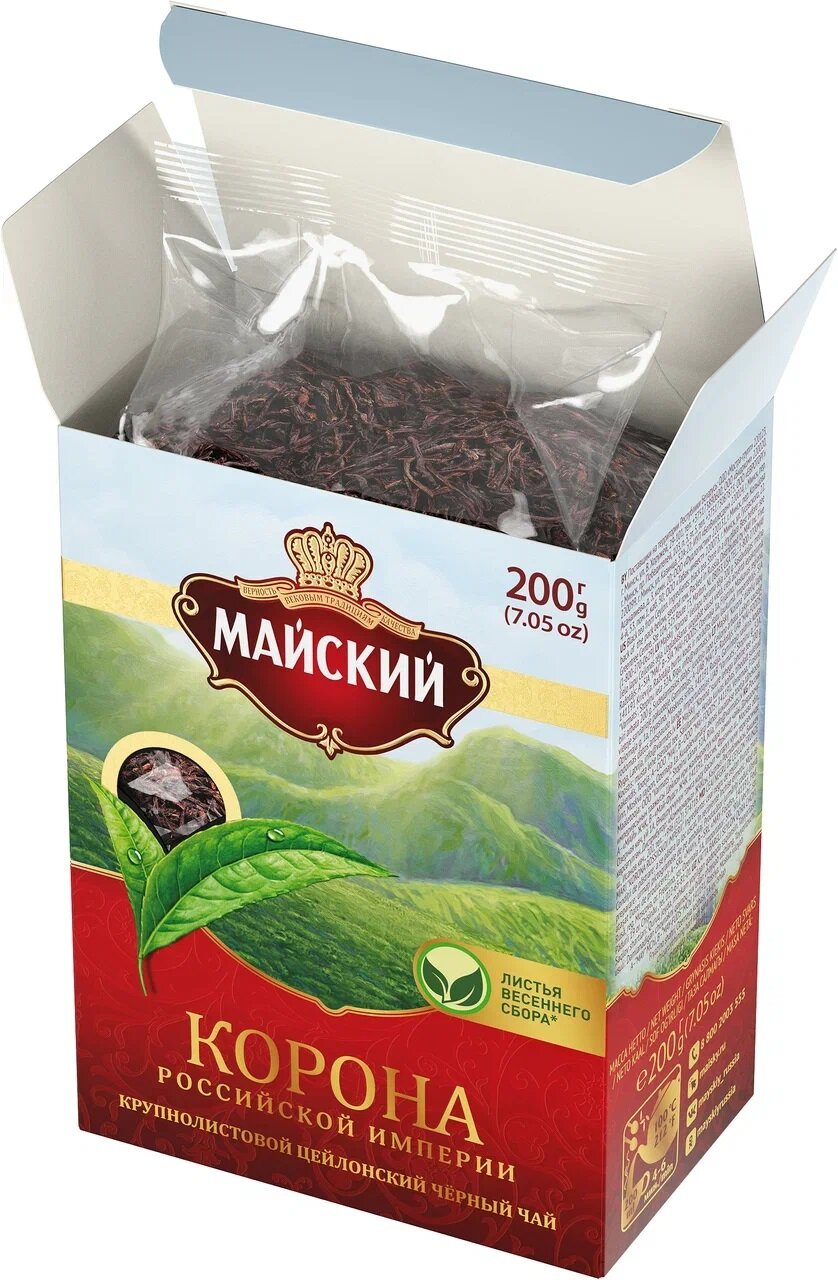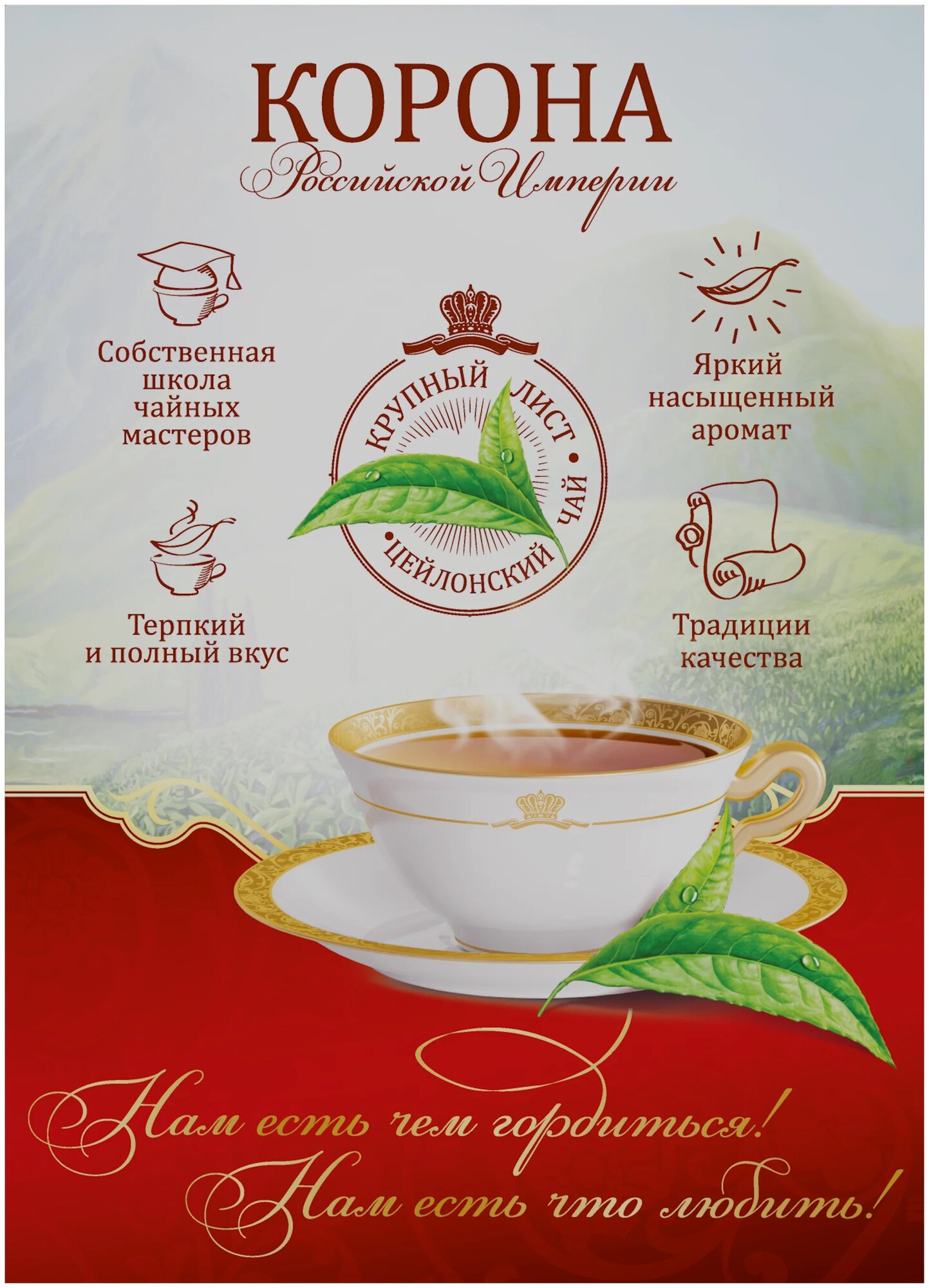 Чай черный Майский Корона Российской Империи 100г - это классический купаж крупнолистового чая, составленный из отборных цейлонских сортов. Напиток медно-коричневого цвета, с богатыми вкусовыми оттенками и насыщенным ароматом, обладает бодрящим эффектом, придает сил, повышает тонус и работоспособность, укрепляет сердечно-сосудистую систему. Рекомендуется заливать чайные листья только свежей кипяченной водой (не кипятить одну и ту же воду больше 1 раза), заваривать в течение 3-5 минут и не оставлять недопитую заварку на следующий день.