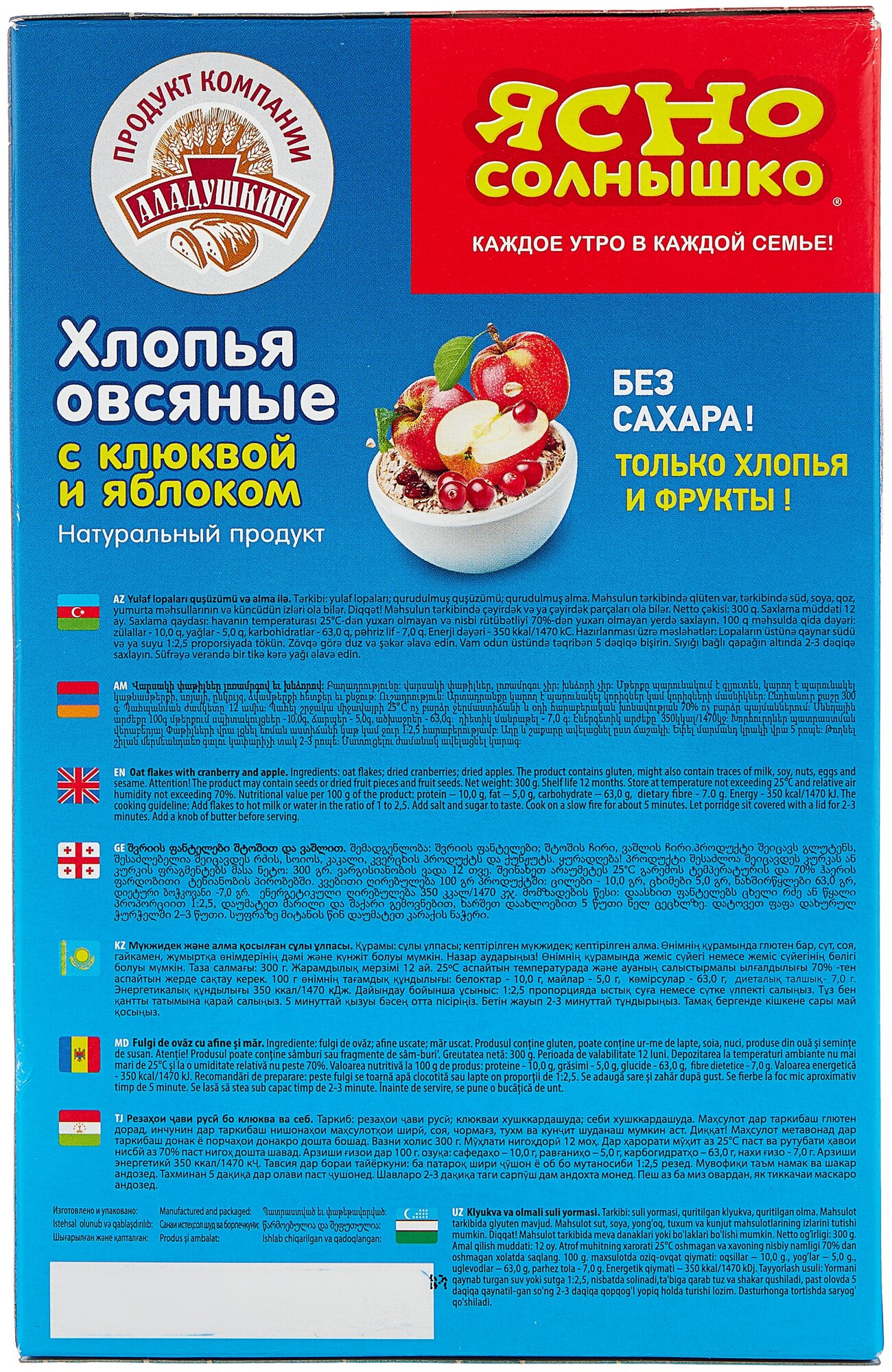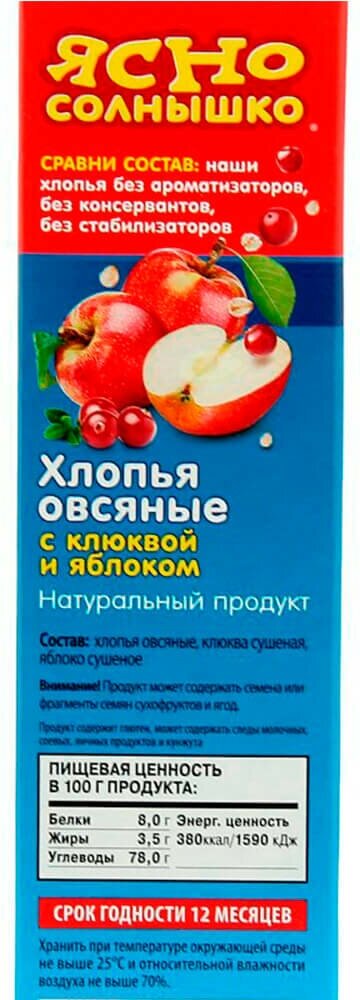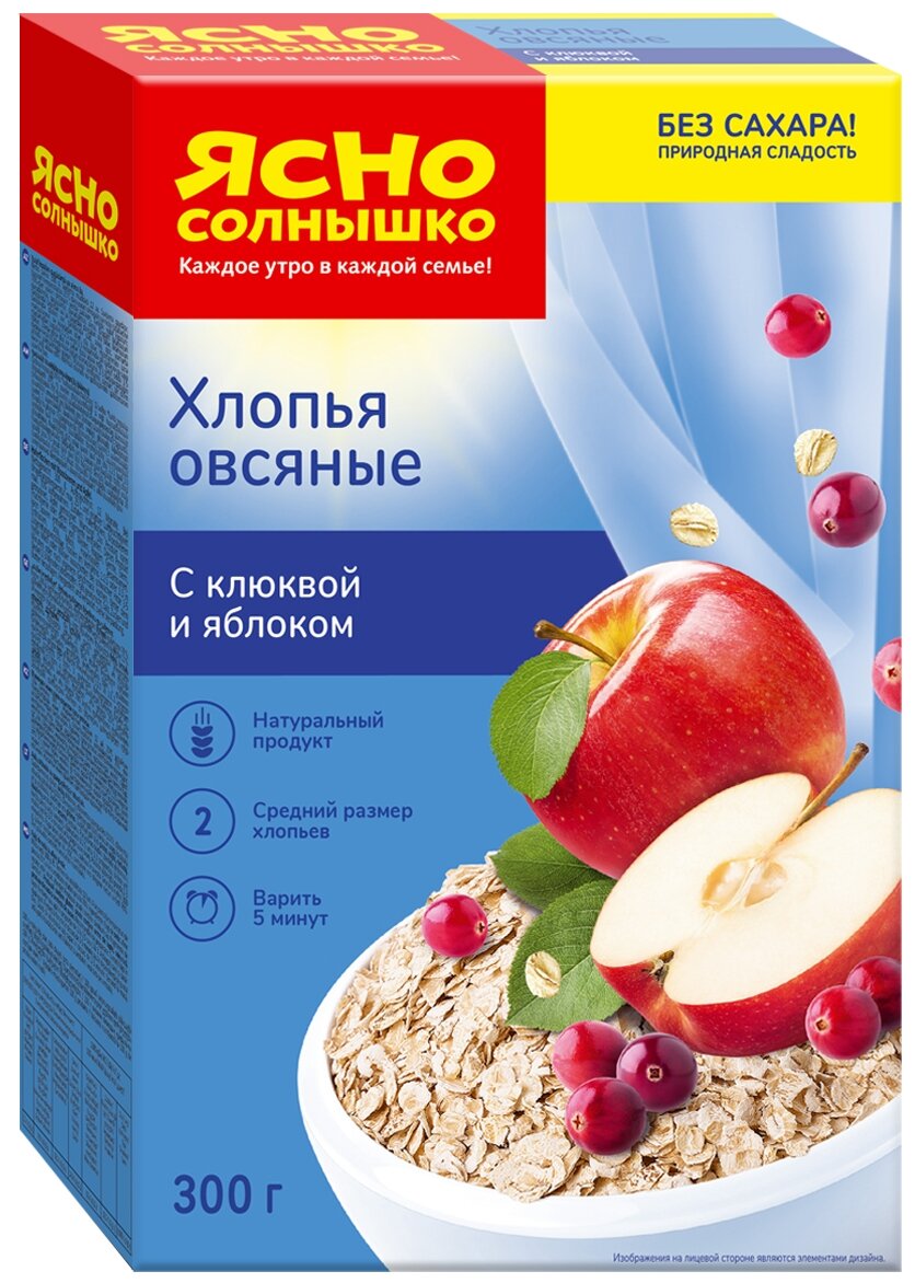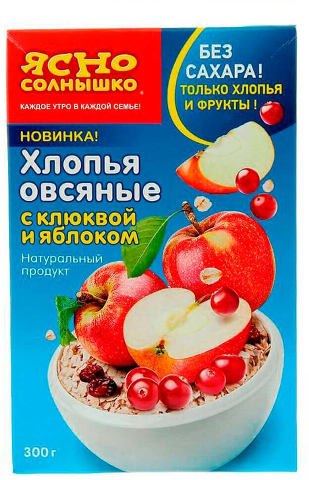 Хлопья Ясно солнышко Овсяные с клюквой и яблоком 300г производятся из резаной овсяной крупы, обработанной по уникальной технологии сохранения зародыша зерна, с добавлением сушеных фруктов и ягод. Растворимые и нерастворимые пищевые волокна нормализуют пищеварение и дарят чувство сытости на длительное время. Это 100% натуральный и удобный продукт быстрого приготовления, в котором сохранилась вся польза и питательная ценность цельных злаков. Теперь, чтобы приготовить вкусную овсяную кашу, вам понадобится всего 7-8 минут: просто залейте хлопья горячей водой или молоком (на 1 стакан хлопьев - 2.5 стакана жидкости), проварите в течение 5 минут и дайте настояться под крышкой еще 2-3 минуты. Продукт не содержит искусственных добавок и сахара.