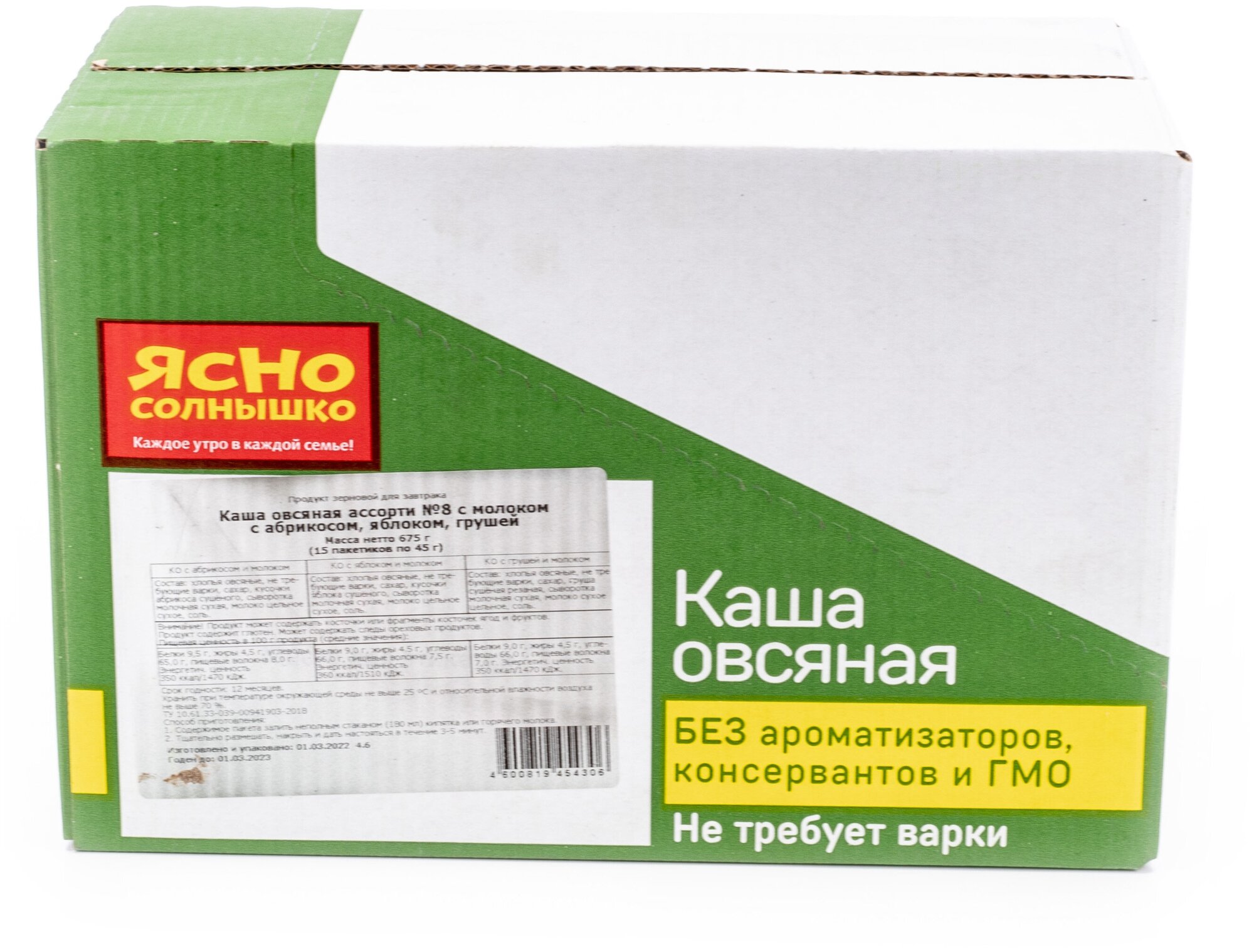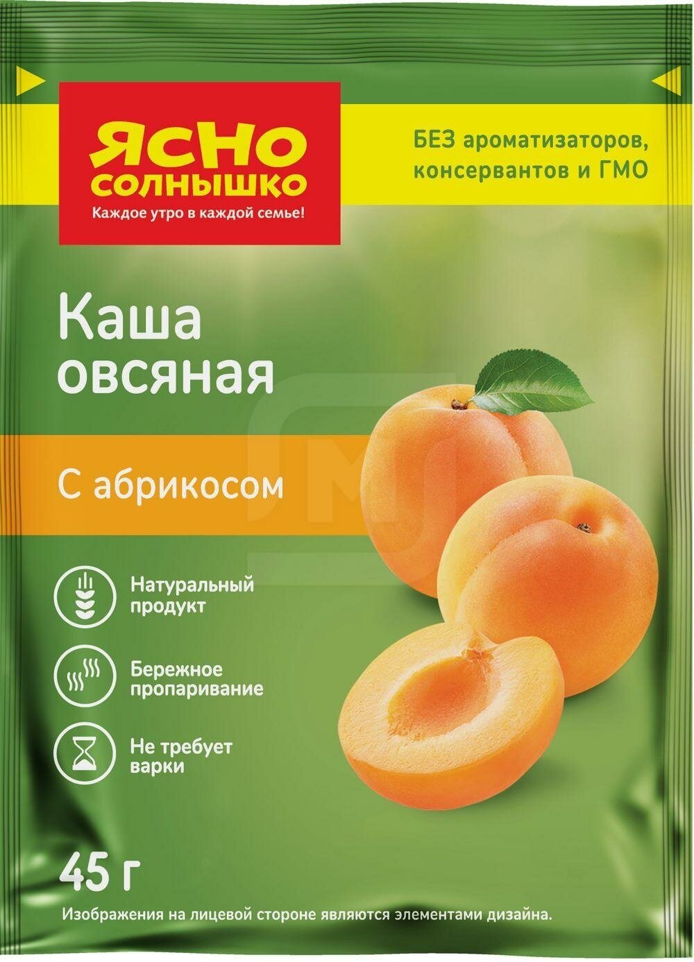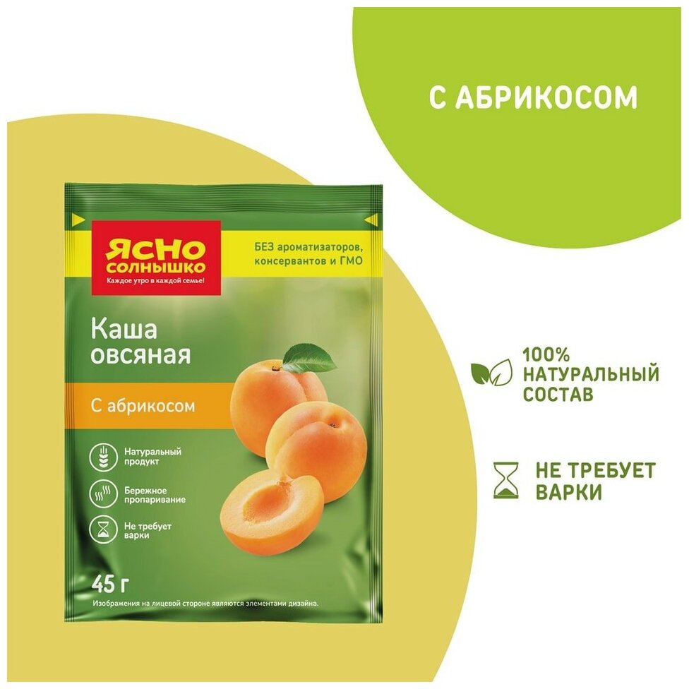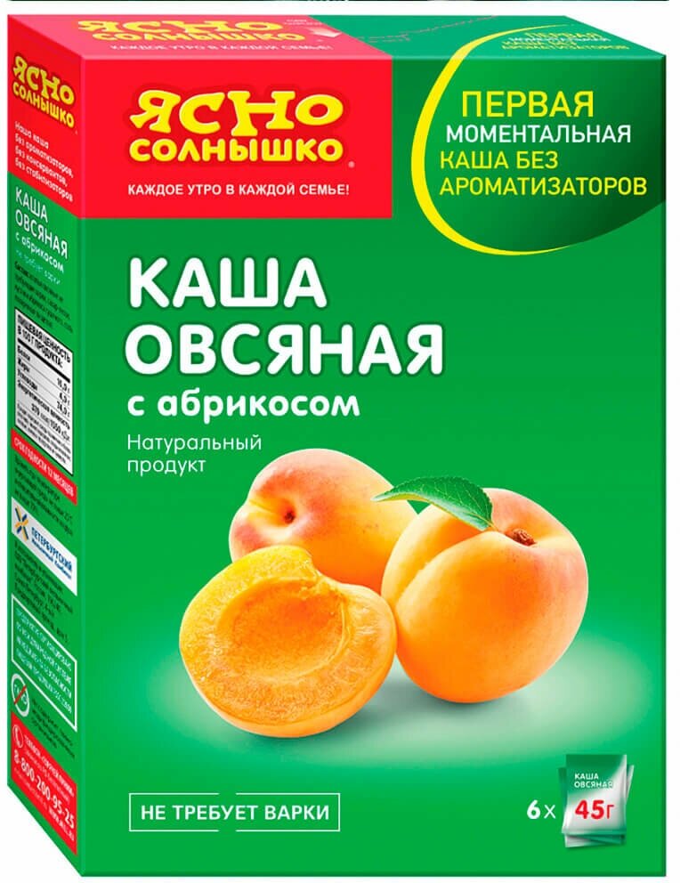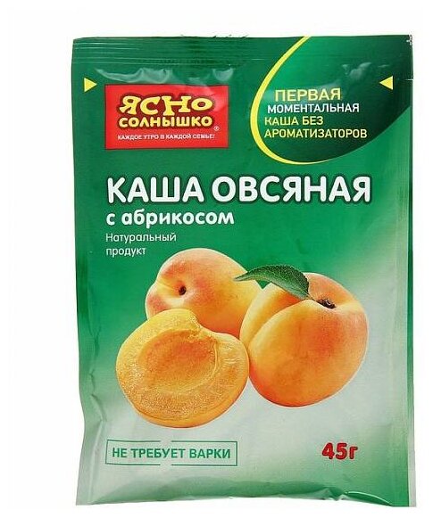 Каша овсяная Ясно солнышко с абрикосом 45г - это каша моментального приготовления, не требующая варки. Она сделана из натуральных ингредиентов без добавления ароматизаторов, консервантов, красителей и стабилизаторов. В ее состав входят овсяные хлопья, обработанные по технологии двойного пропаривания, кусочки сушеного абрикоса, немного сахара и соли. Готовить ее проще простого: переложите смесь в тарелку, залейте 180 мл кипятка или горячего молока, оставьте под крышкой на 3-5 минут и наслаждайтесь вкусным и полезным завтраком!