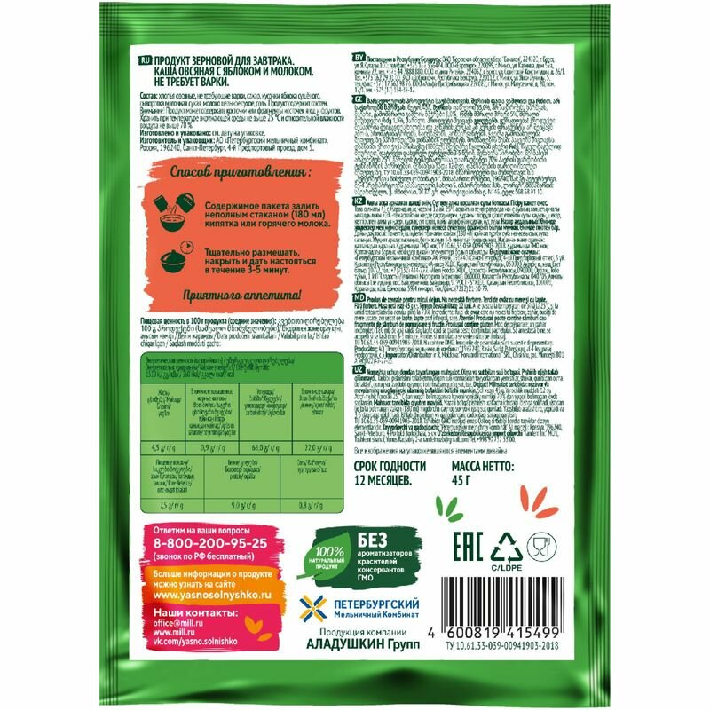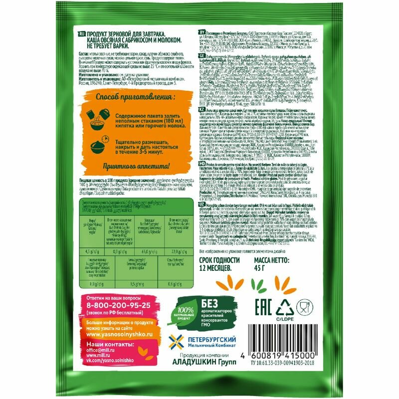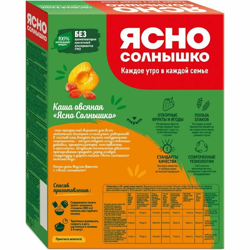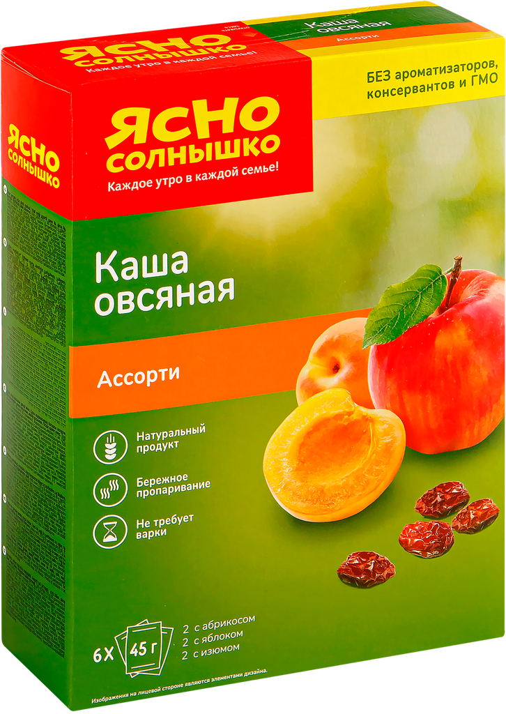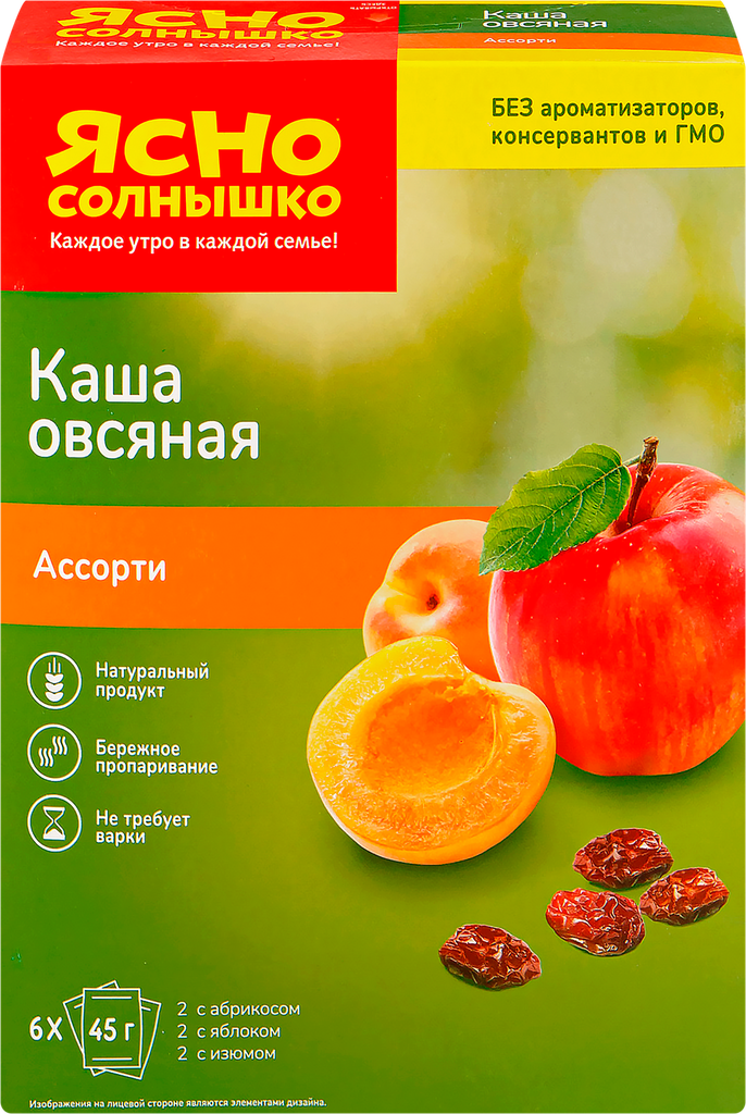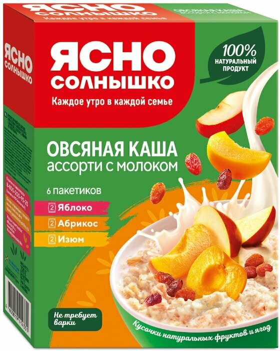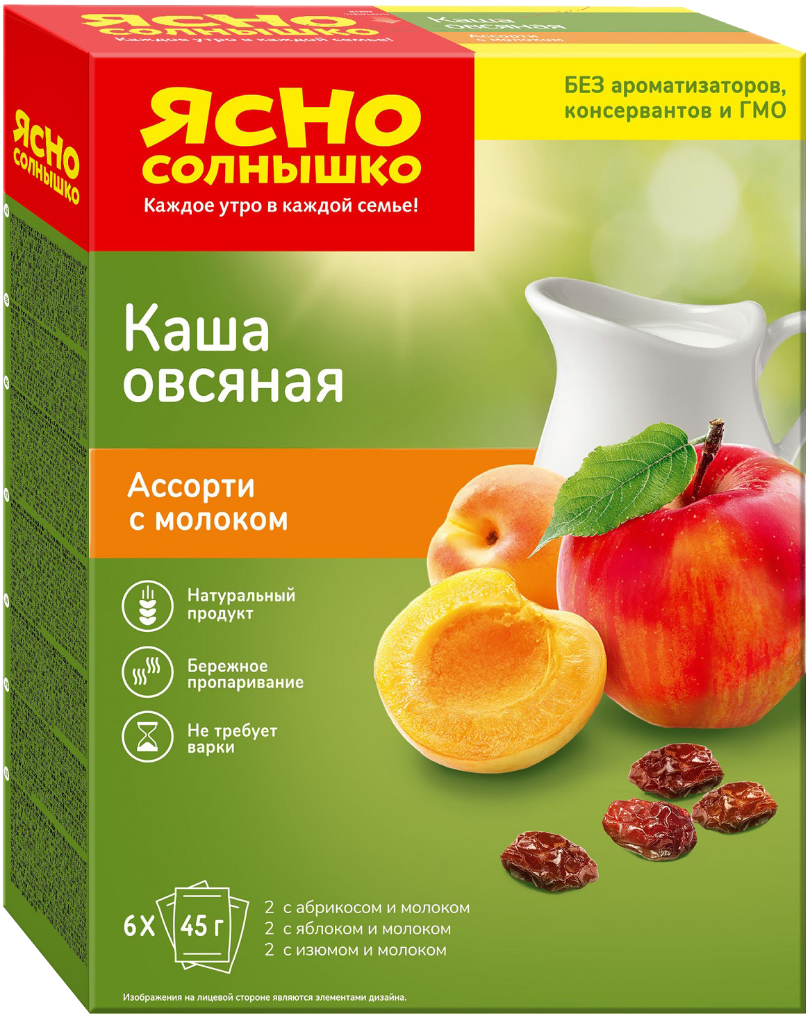 Каша овсяная Ясно солнышко с молоком Ассорти 6пак*45г - это коллекция молочных каш моментального приготовления, не требующих варки. Они сделаны из натуральных ингредиентов без добавления ароматизаторов, консервантов, красителей и стабилизаторов. В состав входят овсяные хлопья, обработанные по технологии двойного пропаривания, цельное сухое молоко, немного сахара и соли, а также три вида наполнителей: изюм, кусочки сушеного абрикоса или яблока. Готовить такие каши проще простого: переложите смесь в тарелку, залейте 180 мл кипятка или горячего молока, оставьте под крышкой на 3-5 минут и наслаждайтесь вкусным и полезным завтраком! В коробке - 6 пакетиков (по 2 штуки каждого вкуса).