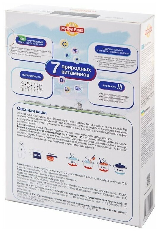 Каша Myllyn Paras Овсяная 500г производится из отборных цельных зерен овса, расплющенных в тонкие хлопья. Она не содержит искусственных добавок, ароматизаторов и консервантов. В ней много пищевых волокон, способствующих очищению кишечника и хорошей работе ЖКТ, есть природные витамины С, К, Е, PP, B1, B2 и B6, а также полезные минеральные вещества. Готовится такая каша быстро и просто: вам нужно вскипятить 1 стакан воды или молока, всыпать 1/2 стакана хлопьев, проварить в течение одной минуты и дать немного настояться под крышкой.
