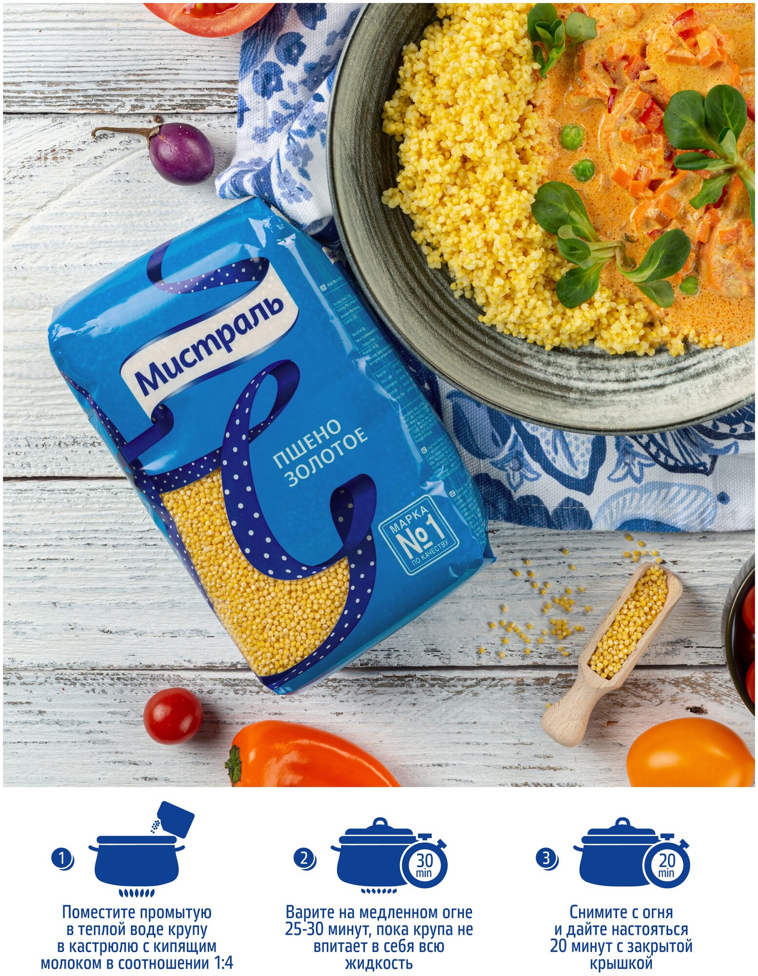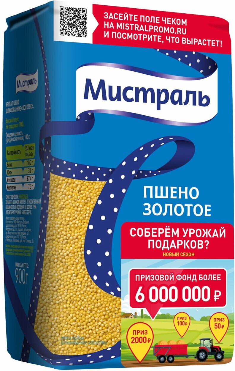 | Описание товара | Шлифованное пшено Мистраль получено из отборных зерен проса, которые проходят многоступенчатую очистку. Имеет однородный светло-желтый цвет, приятный аромат и неповторимый вкус. Пшено обладает большой питательной ценностью и богато растительными белками. |