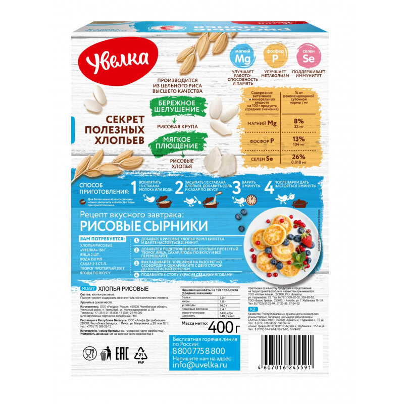 Хлопья Увелка Рисовые 400г приготовлены из цельного круглозерного риса, прошедшего двухэтапную очистку от примесей, лузги и битых ядер. Чистые отборные зерна подвергаются бережной обработке путем резания и сплющивания, в результате которых получается 100% натуральный продукт, сохранивший всю пользу цельных злаков. Имея под рукой такие хлопья, приготовить быстрый, вкусный и полезный завтрак вам не составит никакого труда: доведите до кипения воду или молоко, засыпьте в кастрюлю хлопья (из расчета 0.5 стакана сухого продукта на 1 стакан жидкости), проварите всего 3 минуты и дайте немного настояться. Подавайте кашу со сливочным маслом, ягодами, вареньем, медом или сухофруктами.
