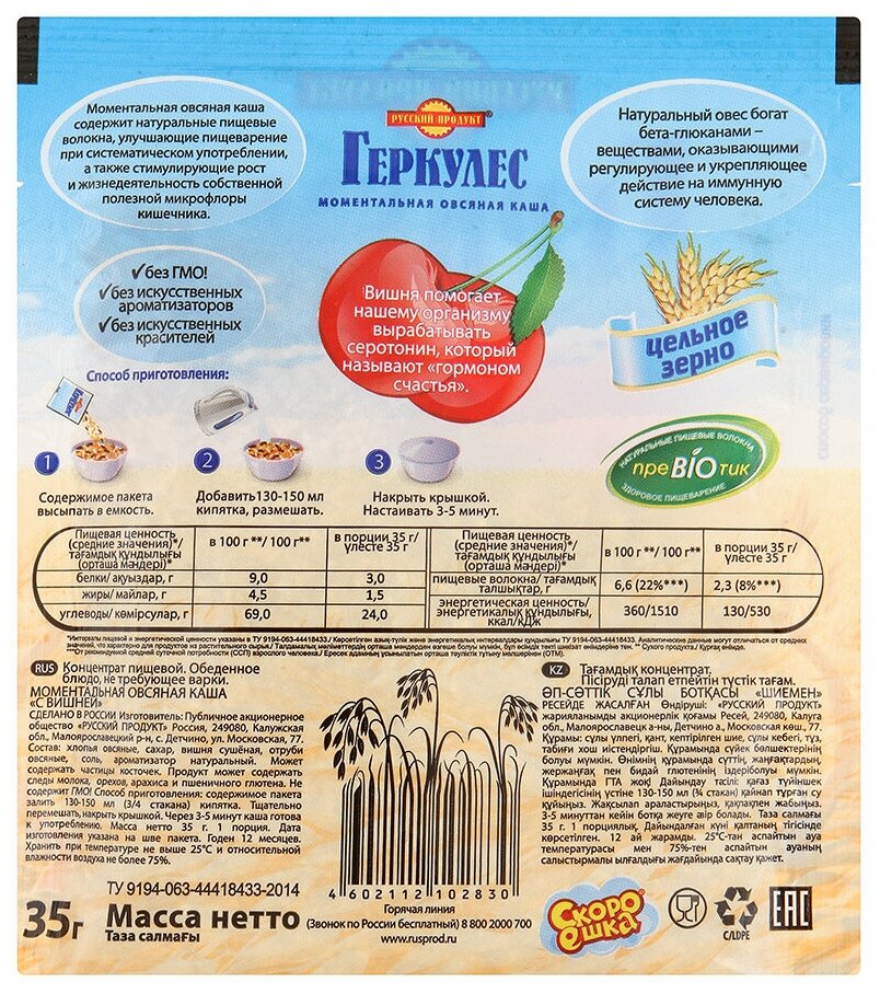 Сервис сравнения цен СкидкаГИД предлагает сравнить цены на товар «Каша Геркулес Овсяная с вишней 35г Русский продукт»