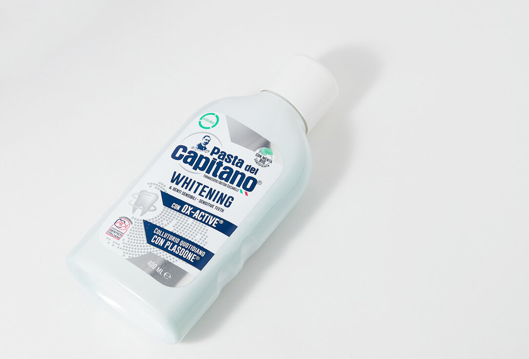 Ополаскиватель для полости рта Pasta del Capitano Отбеливание специально предназначен для отбеливания зубов. Инновационная формула, содержащая Plasdone®, позволяет восстановить естественную белизну зубов, не повреждая эмали и оставляя приятное ощущение свежести в полости рта благодаря содержанию Органической мяты. Идеален для чувствительных зубов, так как цитрат калия снижает их чувствительность, в то время как Betaine успокаивает и предотвращает раздражение десен.
