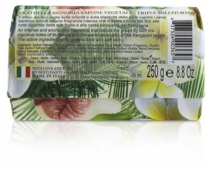 Натуральное растительное мыло Флорентийский инжир сочетает в себе ценные и благородные ингредиенты вместе с изысканными и драгоценными маслами. Интенсивный, чарующий аромат, в котором замечательно смешались терпкие ноты зеленого инжира, задорные ноты его листьев и теплая чувственность цветов франжипани.