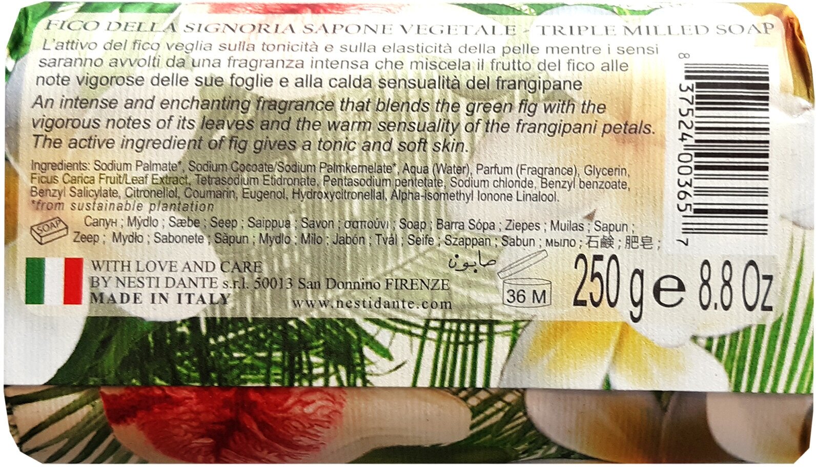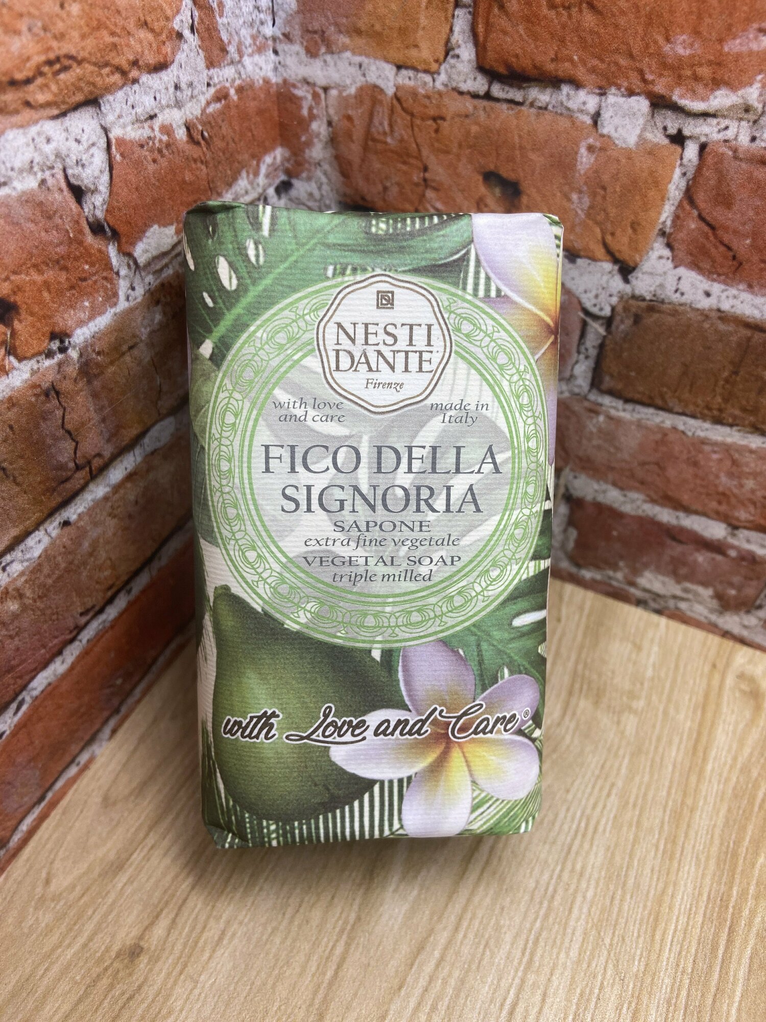 Мыло Fico della Signoria (Флорентийский инжир) имеет аромат свежести зеленой мякоти инжира. Экстракт мякоти и листьев инжира (ficus carica fruit/leaf) содержит пектиновые вещества, дубильные вещества, ми