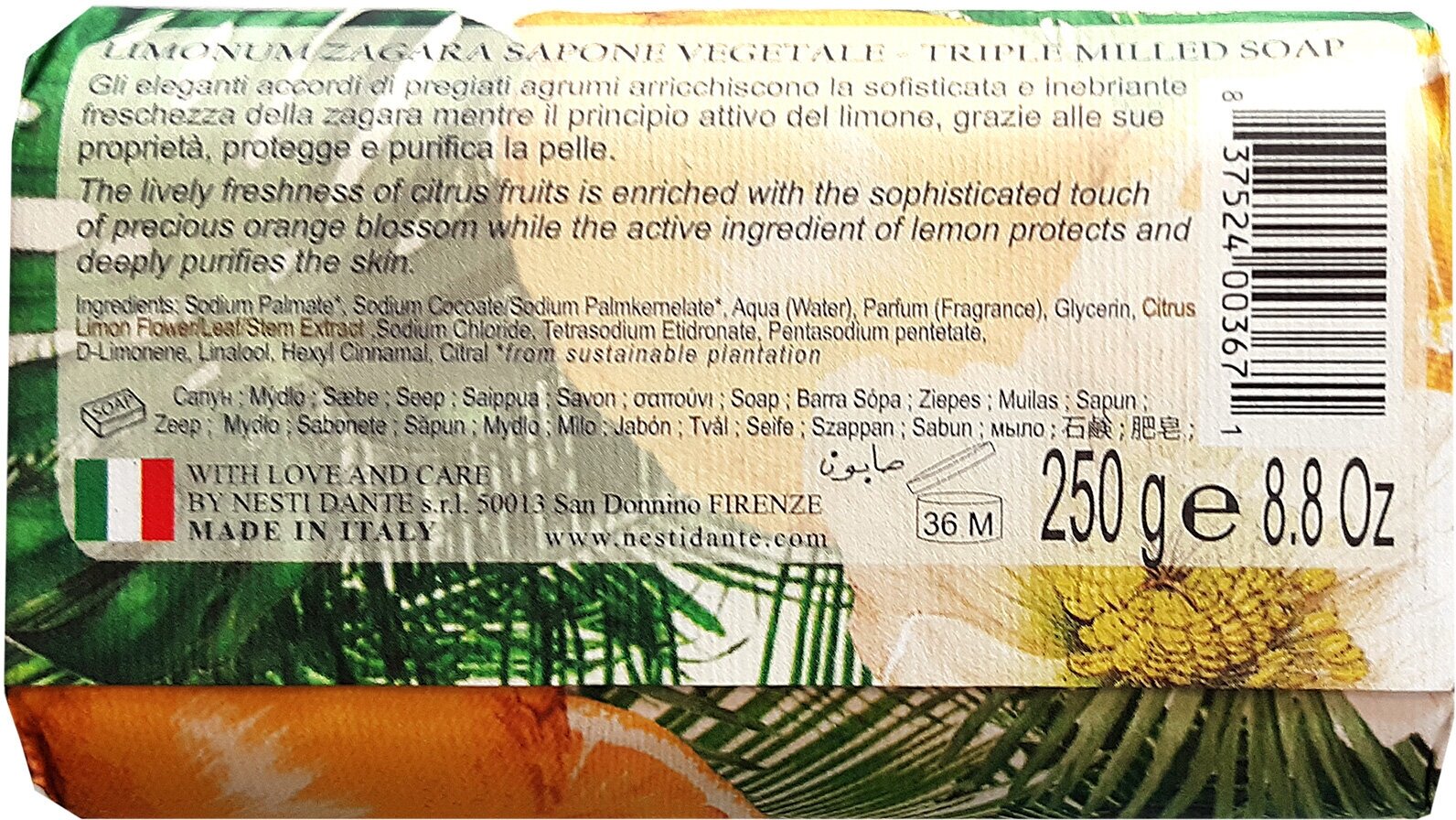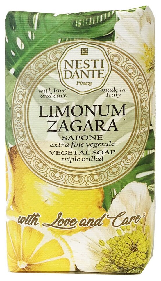 Мыловары и парфюмеры Nesti Dante с гордостью представляют новую линию мыла «С Любовью и Заботой». Оставаясь верными своей философии «работать, чтобы быть лучшими, а не самыми крупными» мастера Nesti Dante создали новую формулу с активными ингредиентами, которые получены в ходе длительного процесса мацерации, что обеспечивает их высокое содержание в мыле. Limonum Zagara (Лимонный цветок) это нежная, сладковато-горькая, с зелеными аспектами прохлада лимонного дерева. Экстракт зелени лимона (citrus limon flower/leaf/stem) придает коже упругость и тонус, увлажняет; обладает антисептическим и противовоспалительным действием.