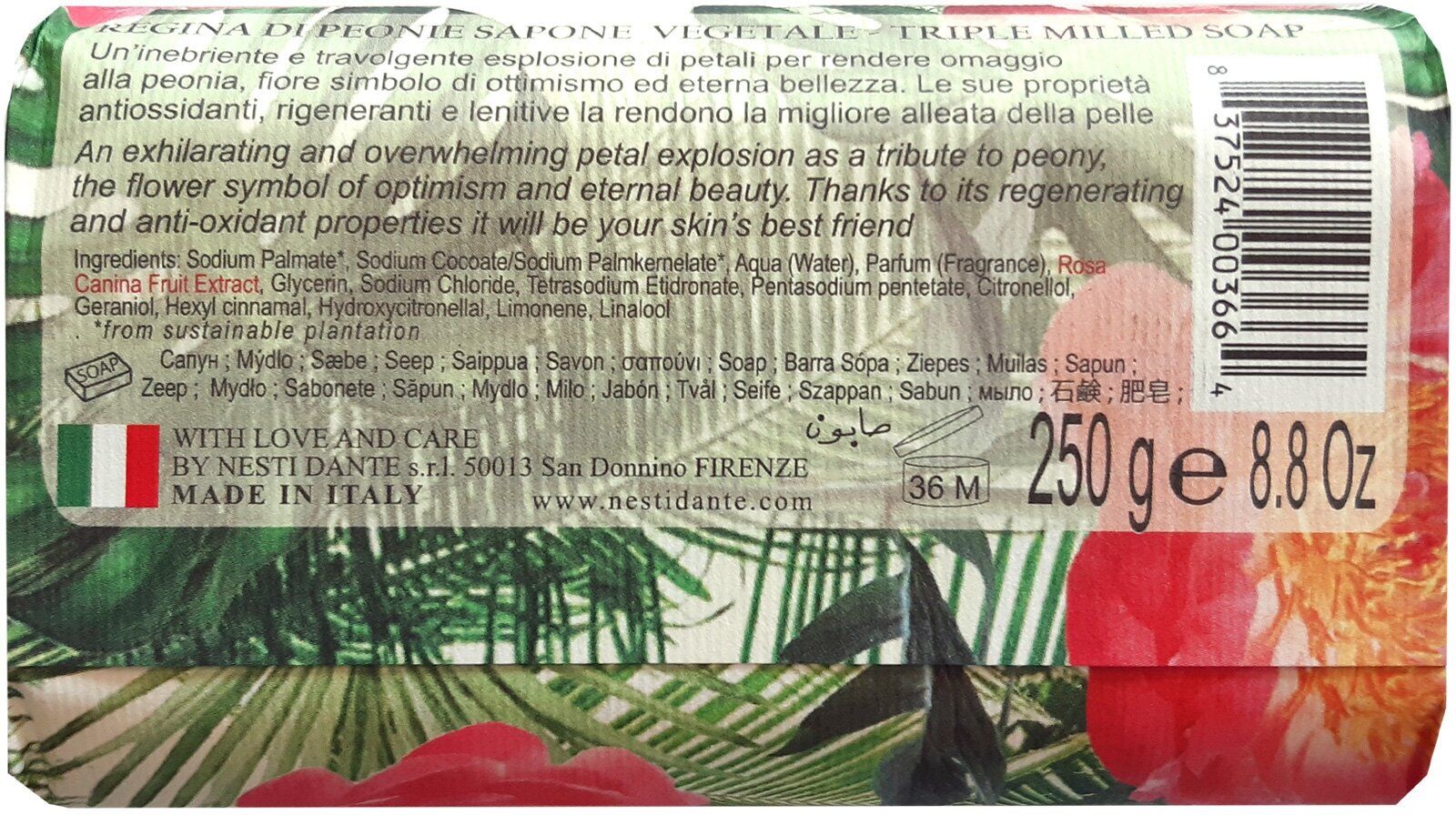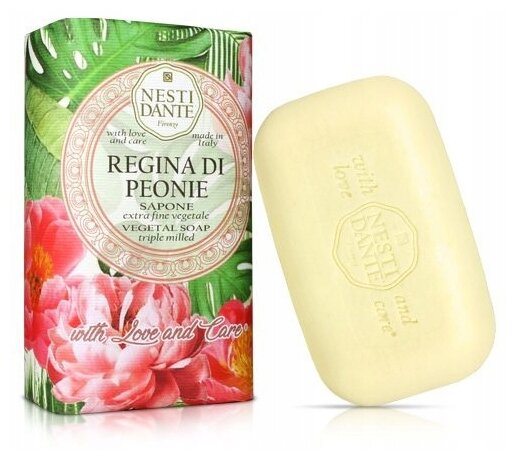 Мыловары и парфюмеры Nesti Dante с гордостью представляют новую линию мыла «С Любовью и Заботой». Оставаясь верными своей философии «работать, чтобы быть лучшими, а не самыми крупными» мастера Nesti Dante создали новую формулу с активными ингредиентами, которые получены в ходе длительного процесса мацерации, что обеспечивает их высокое содержание в мыле. Аромат мыла Regina di Peonie (Королевский пион) это фантазия на тему утреннего пробуждения сада немного травянистый с прохладой аромат с едва уловимыми цветочными аспектами. Экстракт плодов дикой розы (rosa canina fruit oil) обладает мощным увлажняющим эффектом, способствует регенерации кожи.