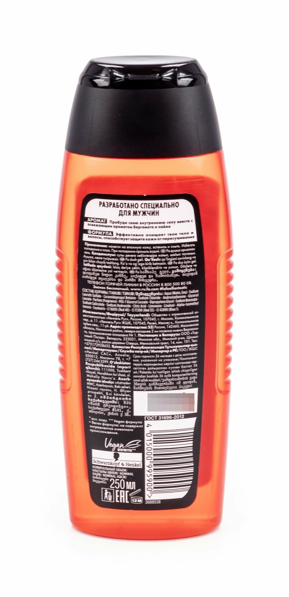 | Химический состав | aqua, sodium laureth sulfate, cocamidopropyl betaine, sodium chloride, parfum, androstadienone, niacinamide, polyquaternium-7, peg-7 glyceryl cocoate, propylene glycol, citric acid, butylphenyl methylpropional, linalool, limonene, coumarin, tetrasodium edta, benzophenone-4, sodium benzoate, ci 16035, ci 17200, ci 42090 |