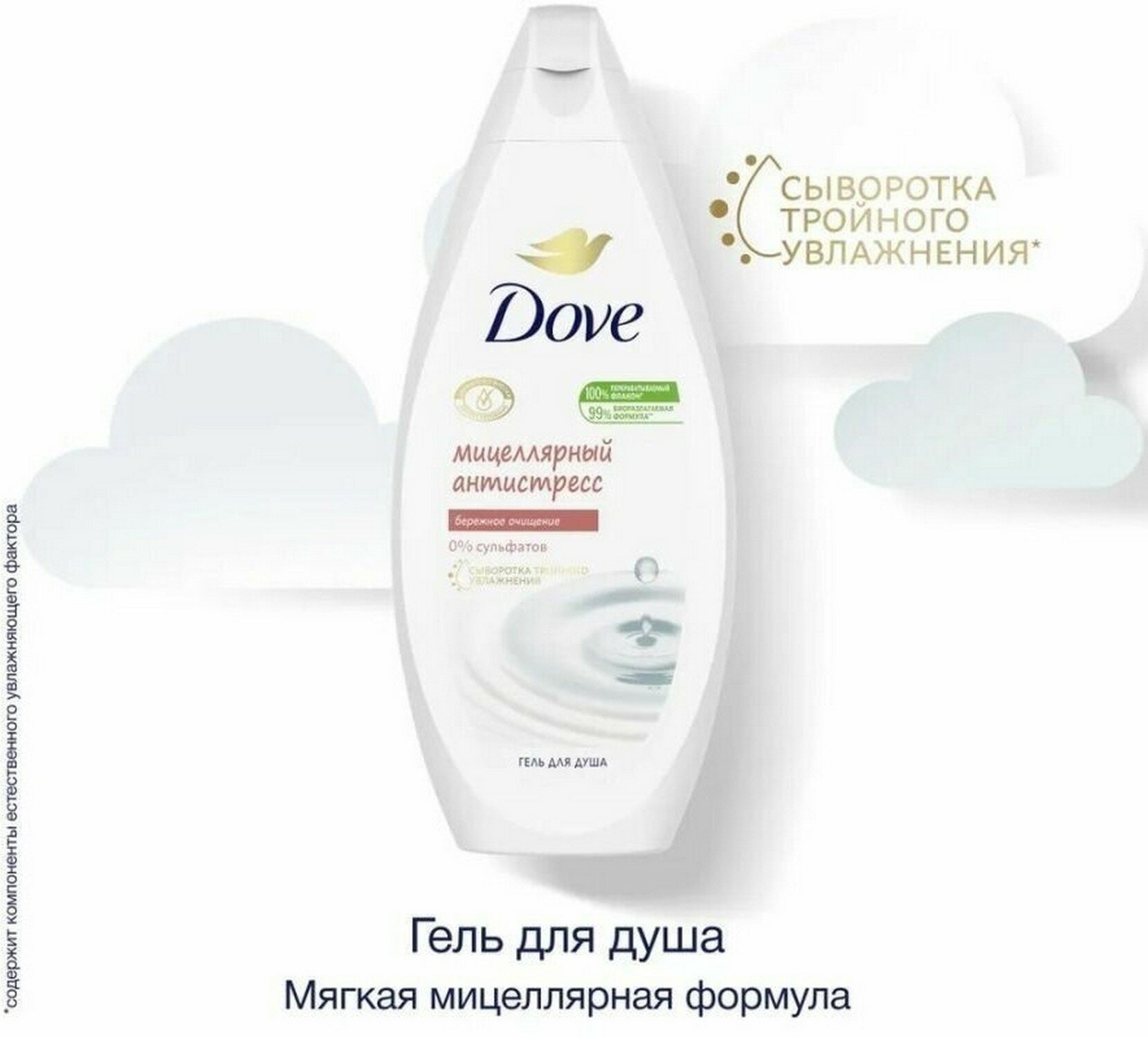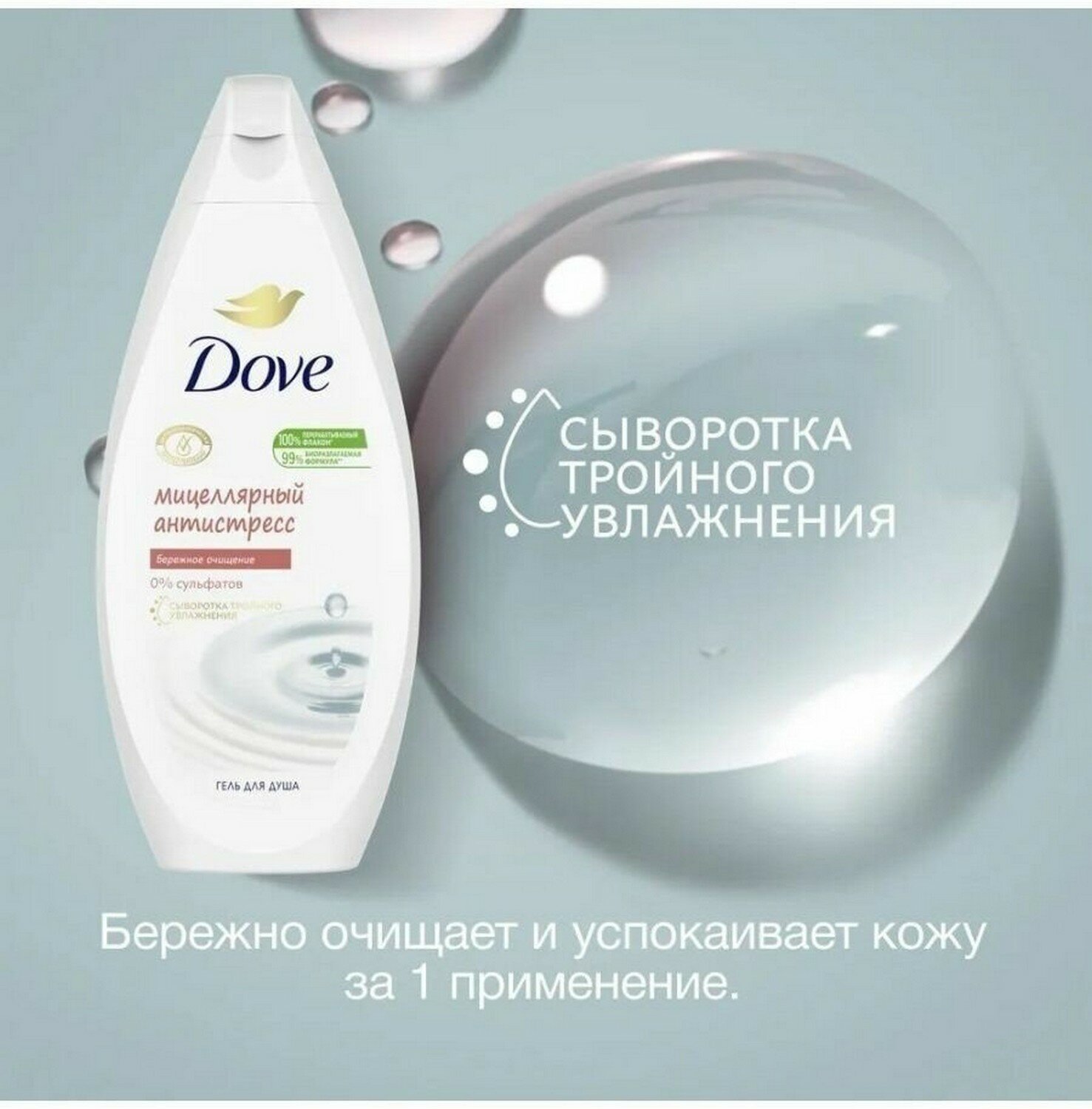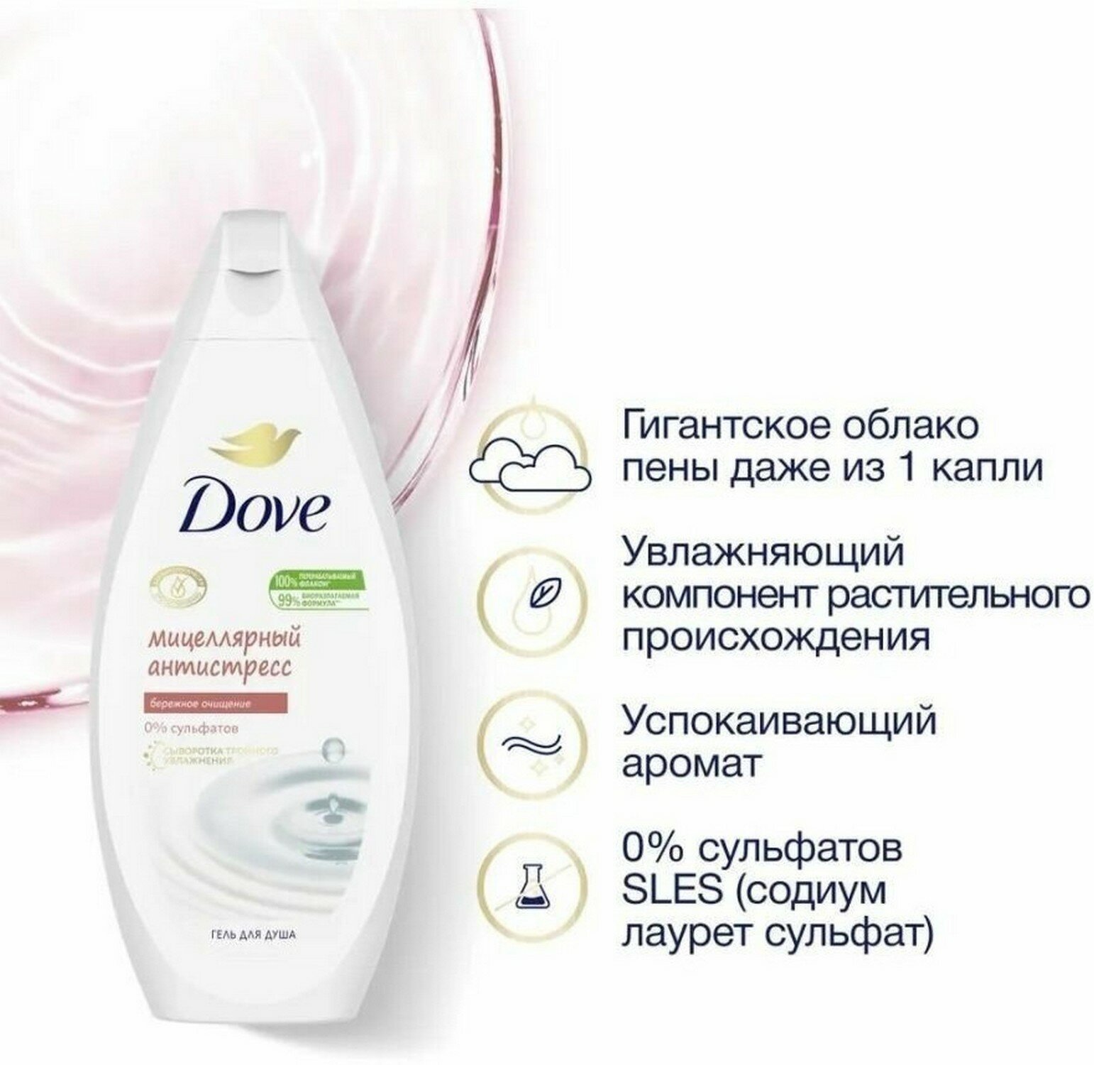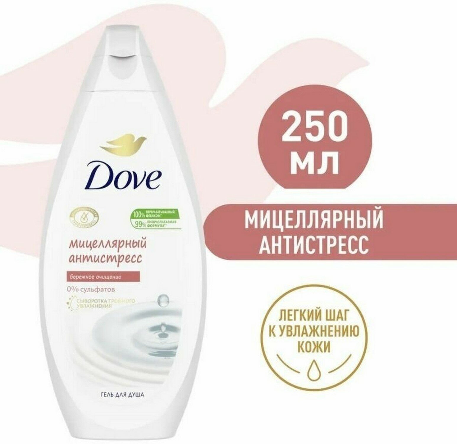 Ультрамягкий мицеллярный гель для душа Dove Антистресс бережно очищает и успокаивает кожу, снимая стресс ежедневного негативного воздействия окружающей среды на нее. Формула без сульфатов помогает очищать кожу бережно и эффективно. Благодаря уникальной формуле Dove кожа после душа увлажненная и ухоженная. Dove верит в то, что регулярный уход за собой придаёт женщине уверенности в своей красоте и помогает раскрыть свой потенциал.