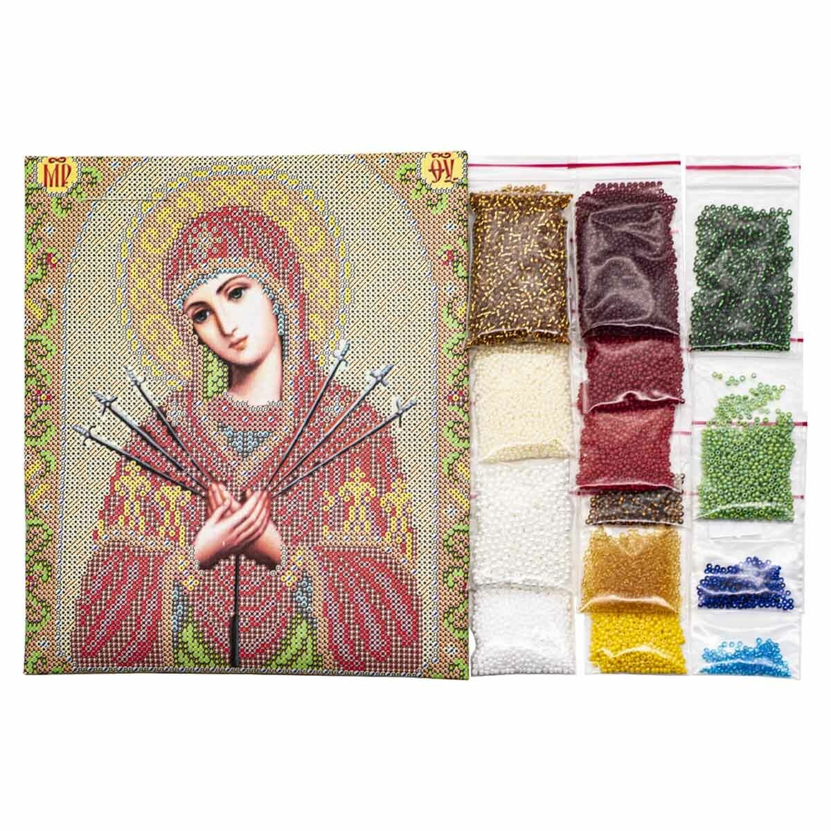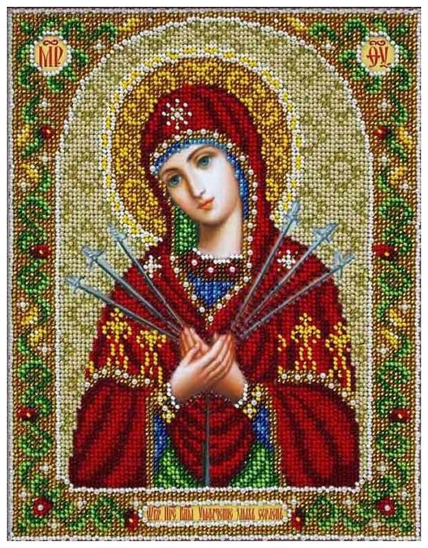 Бисер – традиционный материал для украшения икон. Его ценят за яркий блеск, многообразие цветовой палитры, долговечность. Икона Богородицы "Умиление", расшитая бисером, займет почетное место в вашем домашнем иконостасе или станет прекрасным подарком верующему человеку. Работа выполнена по правилам церковной вышивки: бисером зашиваются отдельные участки, кроме лика, рук и надписей на иконе. Рекомендации: чтобы вышивка получилась аккуратной, используйте пяльцы. Ткань-основу не рекомендуется стирать, поэтому приступать к работе желательно с чистыми руками. Нитки для бисера и рамка не входят в комплект. В наборе: бисер Чехия, льняная ткань с нанесенным рисунком, бисерная игла, подробная инструкция. Количество цветов: 17.