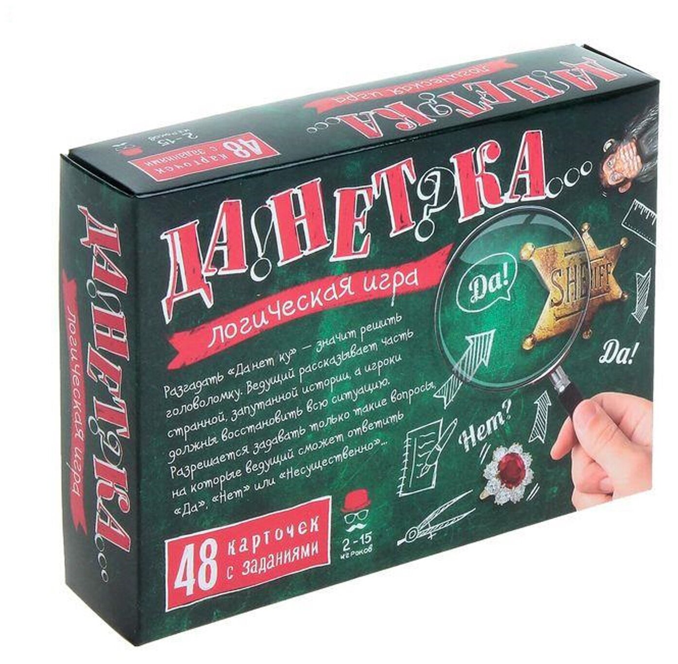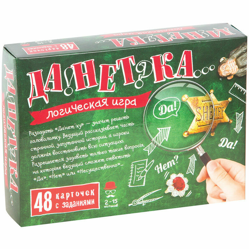 Красочно исполненные карточки настольной игры «Данетка» содержат множество запутанных историй, которые детям предстоит распутать, используя свои дедуктивные навыки и логическое мышление. Разгадывая различные ситуации, дети расширяют свой кругозор. Подробности истории знает только ведущий, которому участники могут задавать вопросы и высказывать свои умозаключения.