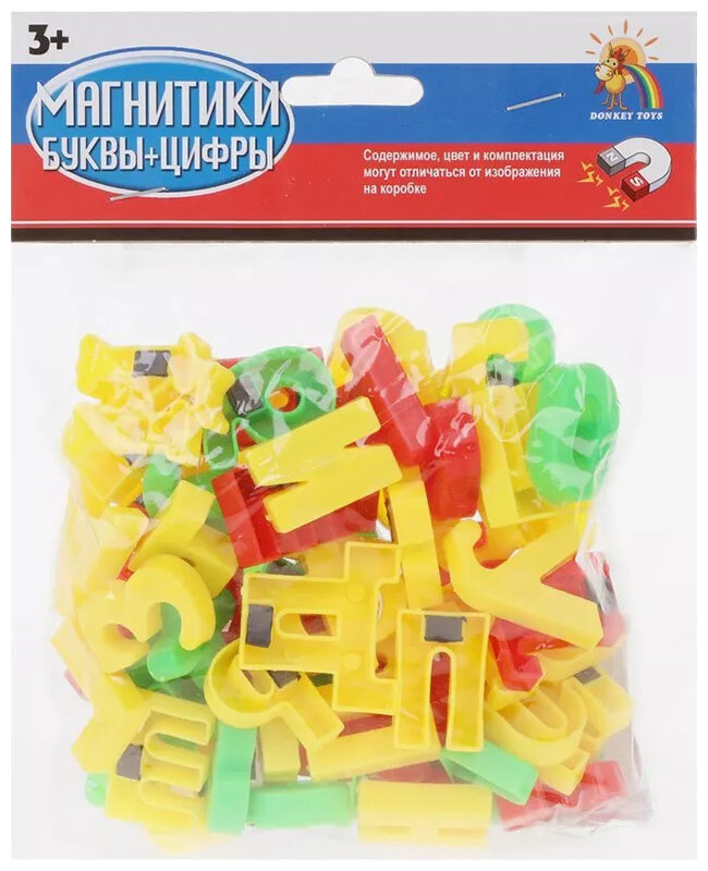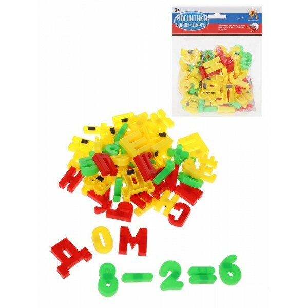 Обучающий набор включает в себя цифры и буквы русского алфавита. Символы изготовлены из яркого цветного пластика, но в каждом установлен магнитик. Благодаря этому ребенок сможет учиться считать и читать, используя в качестве основы холодильник или специальную металлическую доску. К тому же и буквы, и цифры имеют классическую печатную форму, благодаря этому ребенок не запутается и не получит неверную информацию о начертании символа.