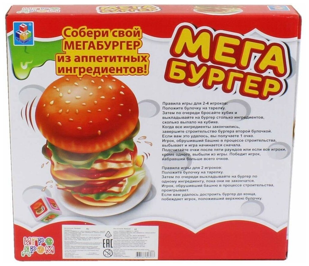 Игра Мегабургер - это весёлая игра, которая понравится как детям так и взрослым. Каждый желающий сможет сыграть в эту увлекательную игру прямо у себя дома и построить самую аппетитную башню... из ингредиентов для бургера! Главное, выбрать максимально ровную поверхность - стол или пол - чтобы построенная башня в виде бургера имела хорошую устойчивость. Цель игры: построить башню из деталей-ингредиентов для бургера так, чтобы она не упала.