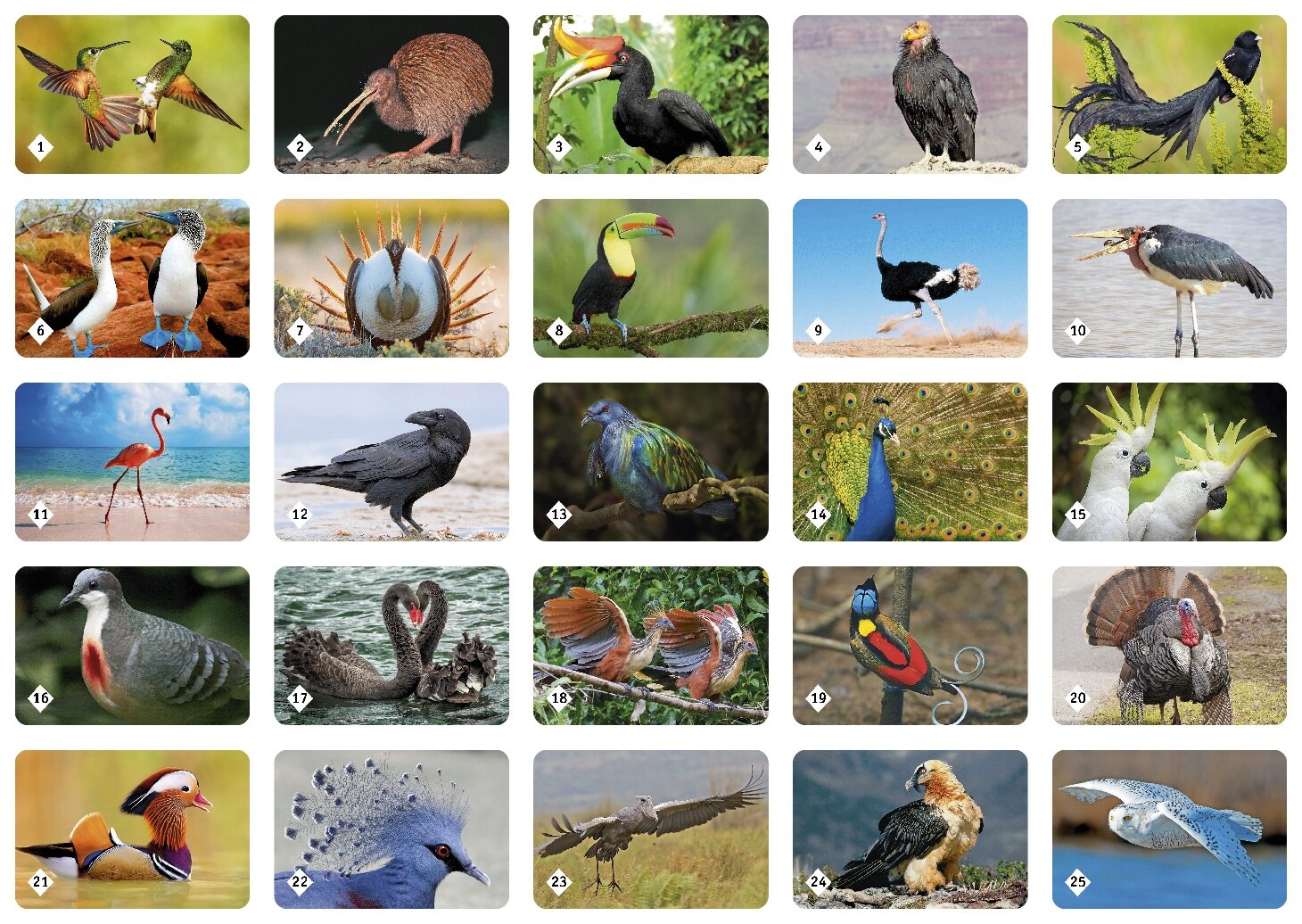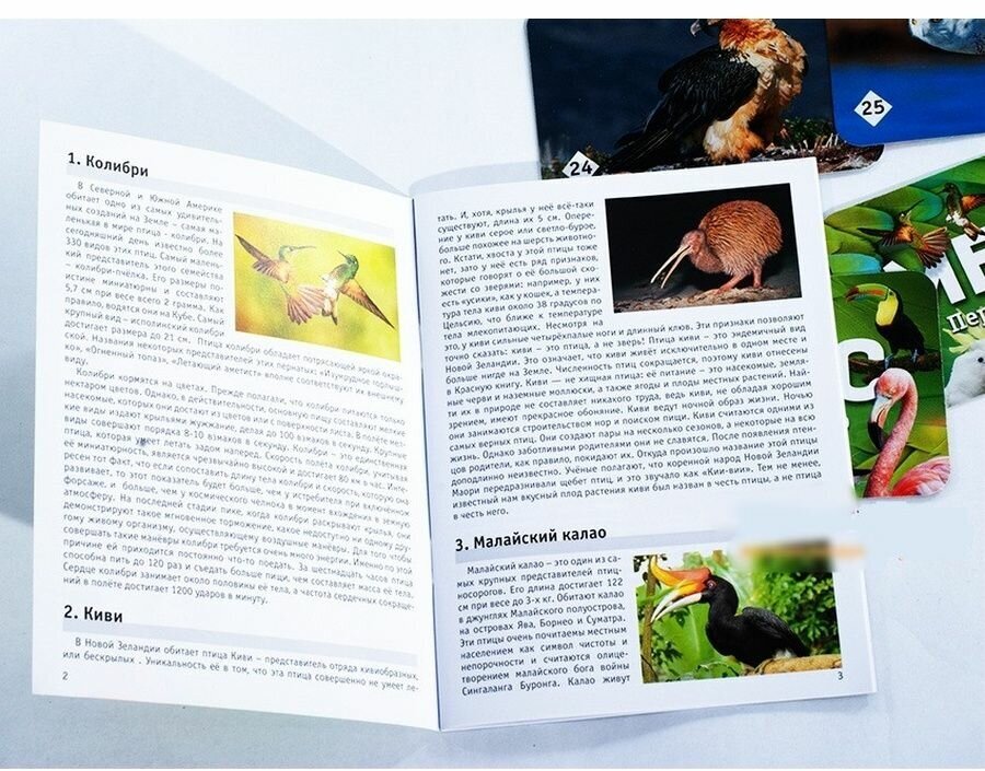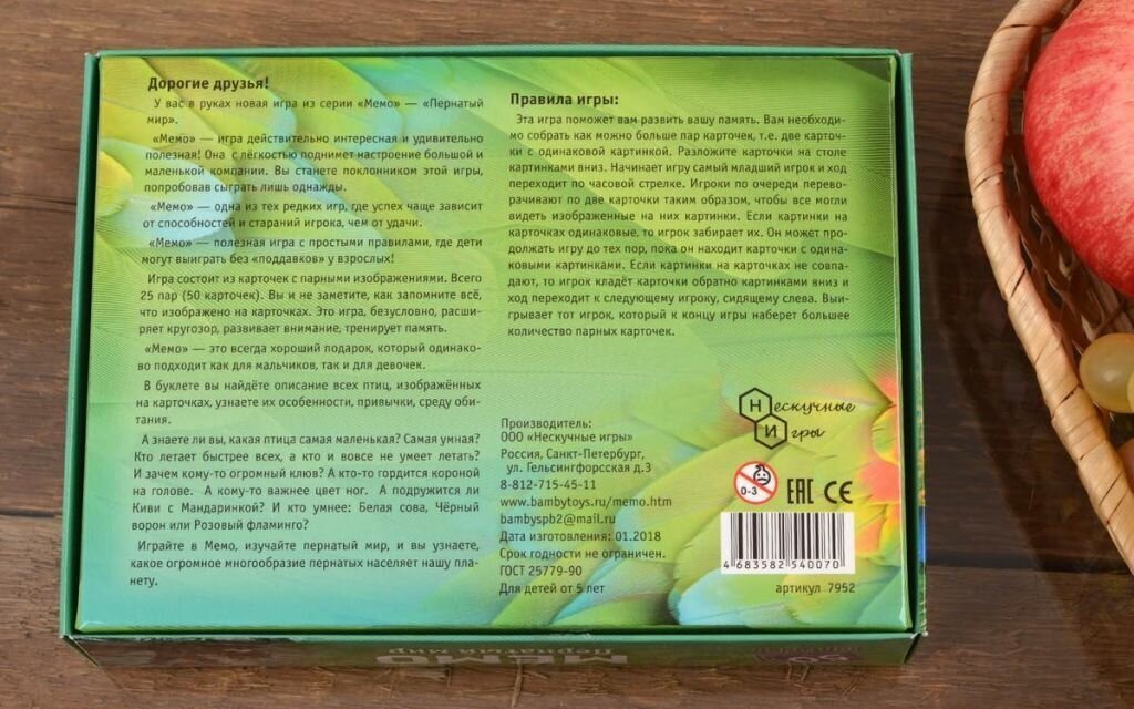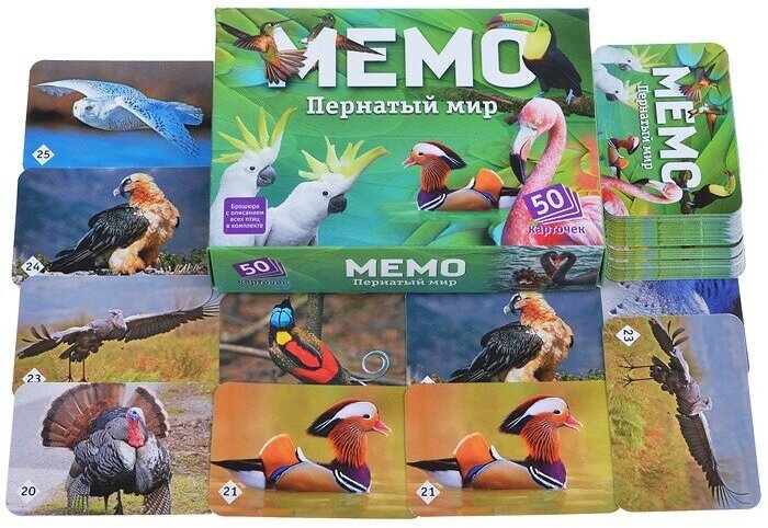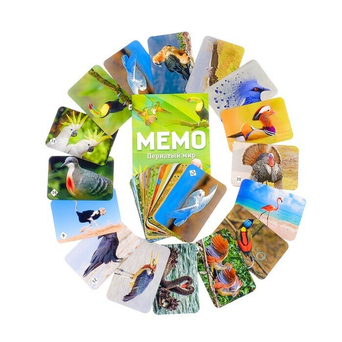 Настольная игра представляет собой карточки с красочными парными изображениями различных птиц. Это увлекательное интеллектуальное состязание отлично тренирует память и развивает смекалку. Также оно поможет юным игрокам расширить кругозор и узнать много нового о крылатых братьях наших меньших, так как на каждой карте имеется познавательная информация. Победителем выйдет тот, кто сумеет набрать наибольшее количество одинаковых картинок.
