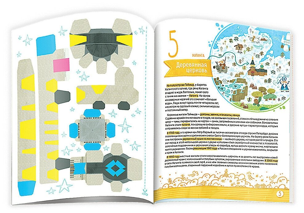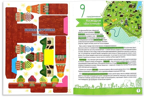 Очень классная книга. Карта-суперобложка раскладывается в формат а1, на ней кроме достопримечательностей России указаны флаги соседних государств, Пушкин и Пётр первый, Дед Мороз и некоторые животные. Разглядывать интересно. Макеты довольно сложные. Нужно покрутить, подумать, чтобы правильно сложить. Детям лет с 10 наверное, и то с поддержкой взрослого.