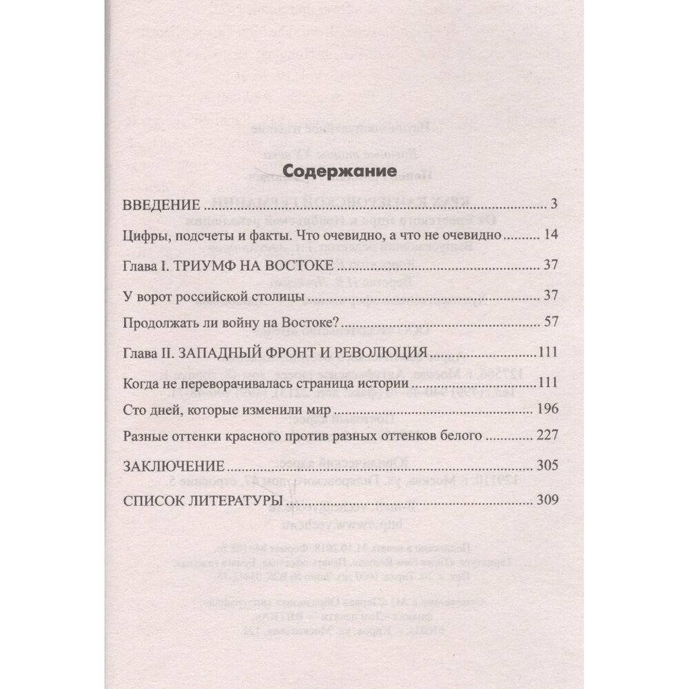 В предлагаемой читателю книге об уже далеких событиях Первой мировой войны делаются попытки ответить на два вопроса: могла ли Германия достойно выйти из войны без репараций и разоружения и мог ли режим кайзера свергнуть советскую власть весной — летом 1918 г., оказав действенную поддержку антикоммунистическим движениям в России? Мы отвечаем положительно на оба вопроса, попутно отыскивая ответы на другой: почему этого не произошло? В работе проводится обзор событий в дипломатической, внутриполитической, социальной и военной сферах жизни Германии в конце 1917 — начале 1919 г. Отдельно рассматриваются недостаточно изученные в России события, связанные с коммунистическим мятежом в Берлине января 1919 г. в контексте контакта немецких ультралевых с российскими большевиками в конце Первой мировой войны. Много внимания уделено в работе вооруженной борьбе Германии против западных союзников во Франции в марте — ноябре 1918 г. с целью освещения вопроса влияния Брест-Литовского мира на общую военную ситуацию в Европе.