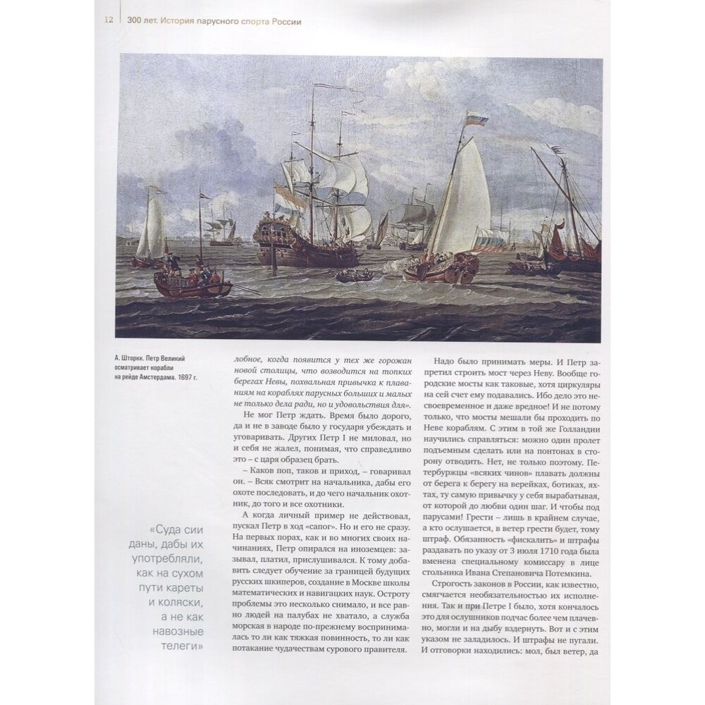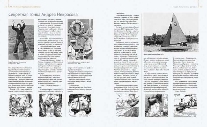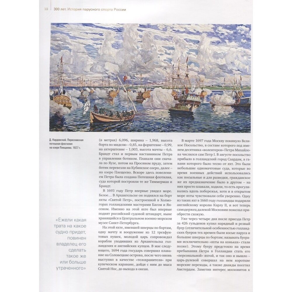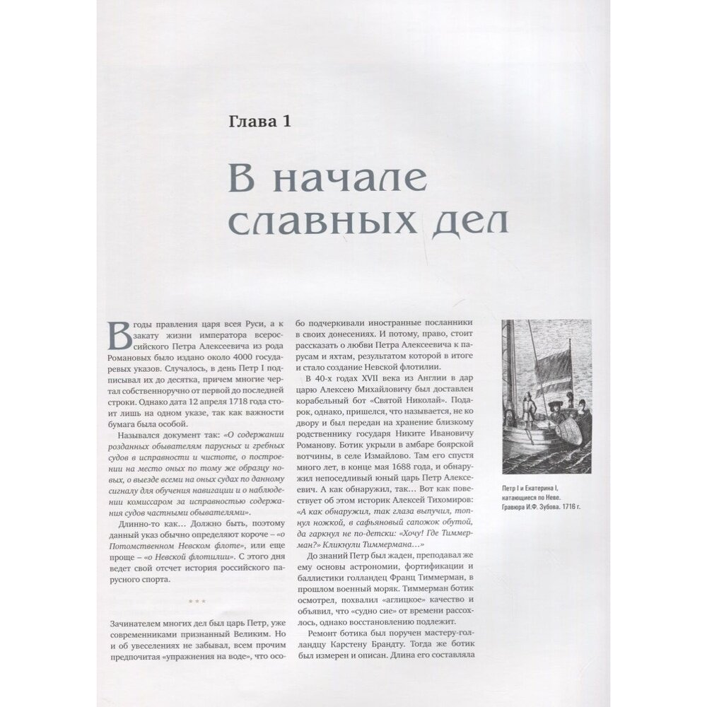 Это уникальная книга - ничего подобного о развитии паруса в нашей стране прежде не издавалось. 272 страницы большого формата вместили в себя более четырехсот иллюстраций - гравюр, рисунков, редких фотографий, а также подробнейший рассказ о том пути, который за три минувших столетия прошел отечественный парусный спорт. Указ Петра I о создании Потомственного Невского флота положил начало этой истории, в которой были взлеты и падения, десятилетия забвения и годы успехов. Той истории, которую творили тысячи людей, бесконечно влюбленных в паруса, которая пишется и сегодня.