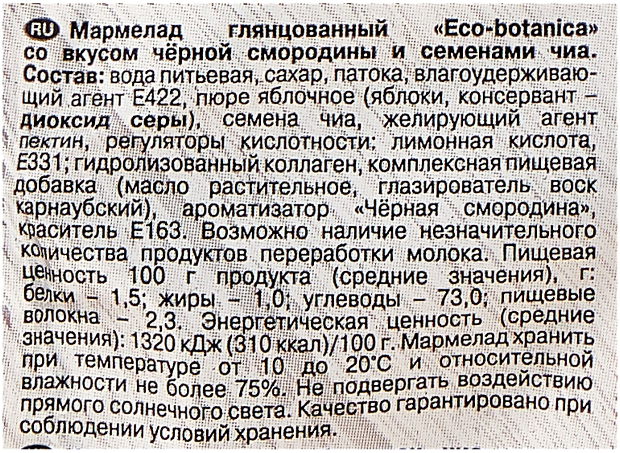 Мармелад Eco-botanica, с черной смородиной и семенами Чиа, 200гСочный мармелад от Eco Botanica со вкусом черной смородины и семенами чиа - это яркий смородиновый вкус и польза натуральных компонентов. Мармелад "Эко Ботаника" - это источник коллагена, необходимого для здоровья суставов, а мелкие, чуть хрустящие семена латиноамериканского растения чиа богаты кальцием, белком, пищевыми волокнами и ненасыщенными жирными кислотами Омега-3 и Омега-6. Состав: вода питьевая, сахар, патока, пюре яблочное (яблоки, консервант - диоксид серы), влагоудерживающий агент E422, семена Чиа, желирующий агент пектин, регуляторы кислотности: лимонная кислота, Е331; гидролизованный коллаген, глазирователь (масло растительное, глазирователь карнаубский воск), ароматизатор "Черная смородина", краситель Е163. Пищевая ценность на 100 г продукта: белки - 1,5 г; жиры - 1,0 г; углеводы - 73,0 г. Энергетическая ценность: 310 ккал. Вес: 200 г. Срок годности: 3 месяца. Хранить при температуре от 10 до 20 градусов Цельсия и относительной влажности не более 75%. Страна производства: Россия.