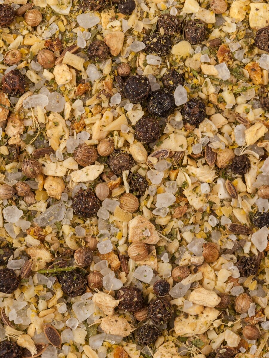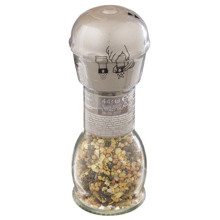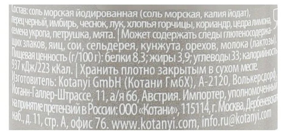 | Состав | соль морская йодированная (соль морская, калий йодат), перец черный, имбирь, чеснок, лук, хлопья горчицы, кориандр, цедра лимона, семена укропа, петрушка, мята. |