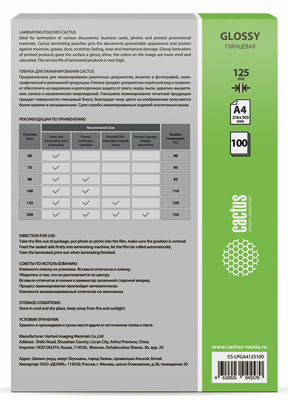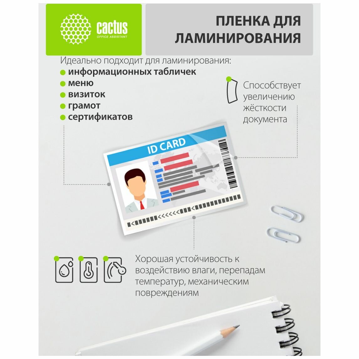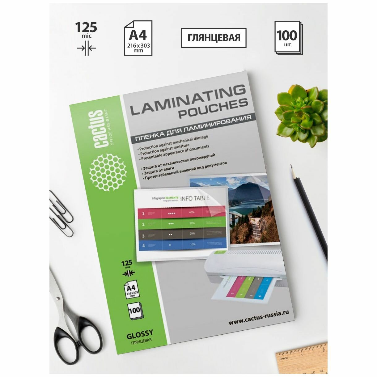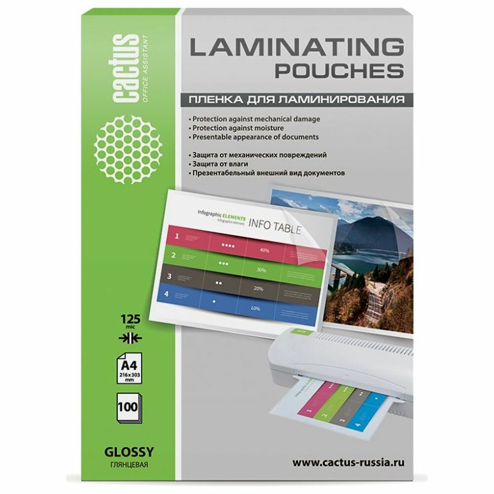 Пленка для ламинирования Cactus 125мкм A4 (100шт) глянцевая 216x303мм