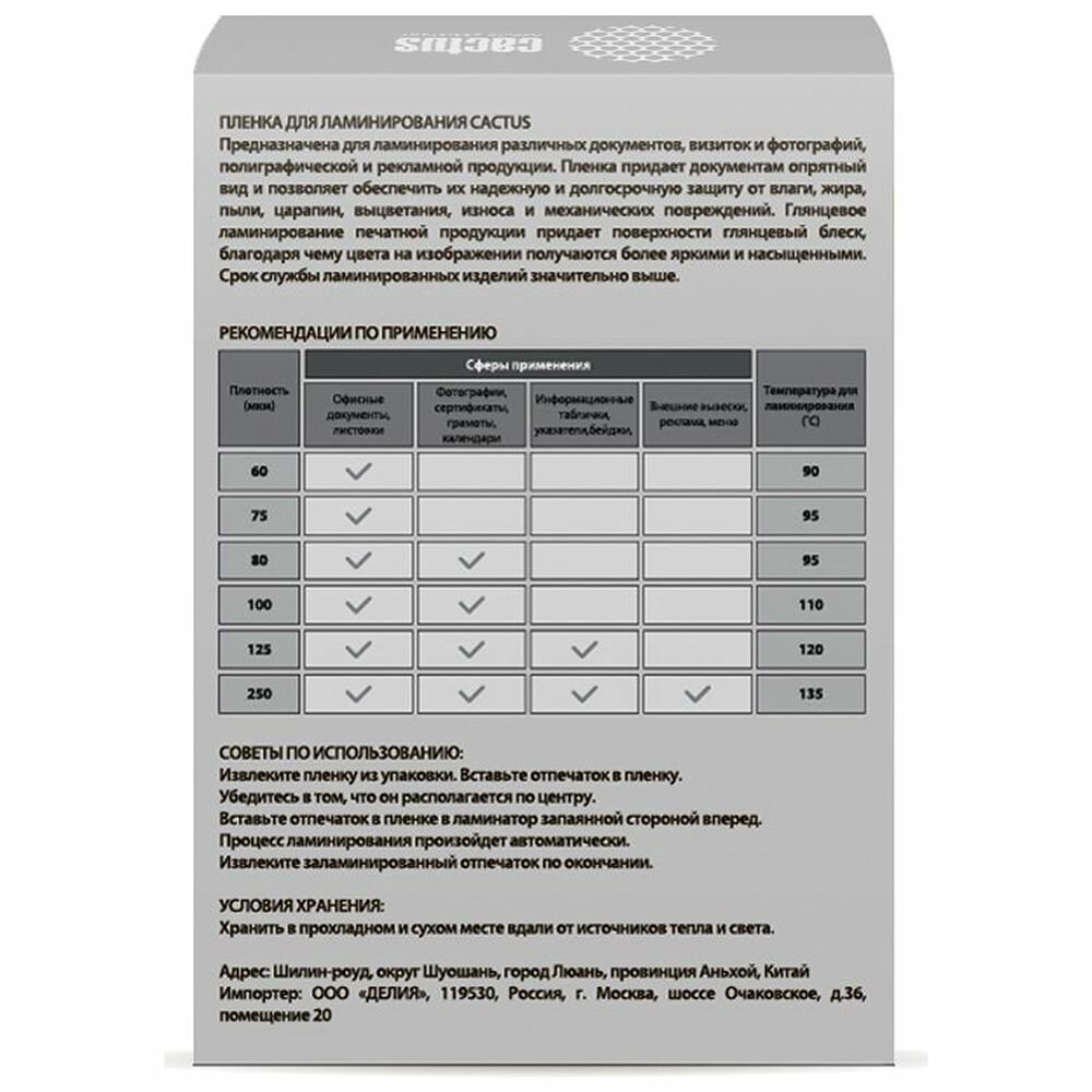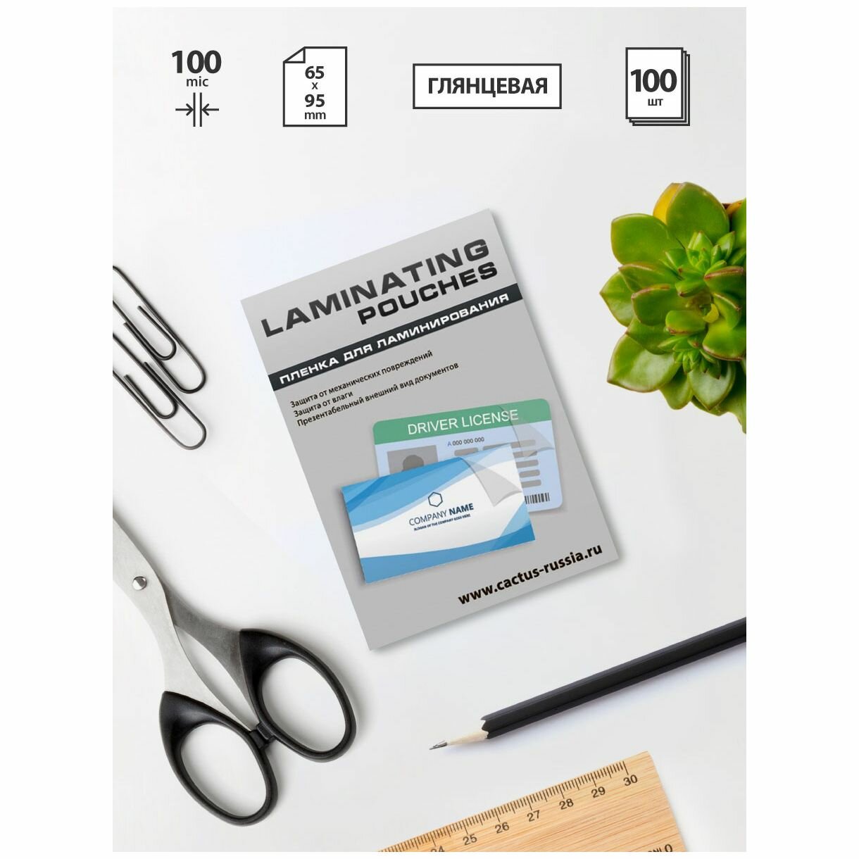 Пленка для ламинирования Cactus 100мкм (100шт) глянцевая 65x95мм