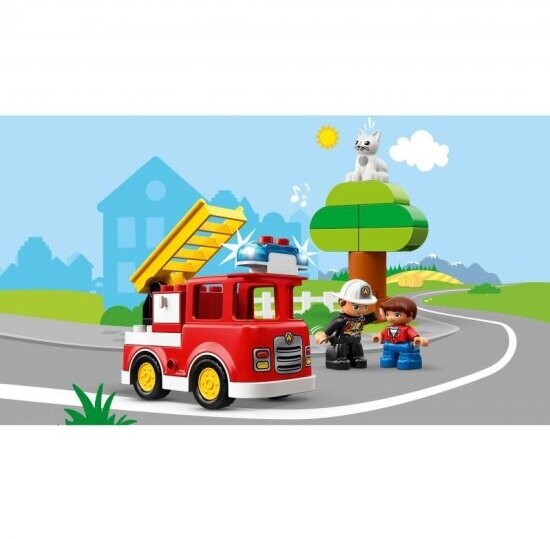 Разыграйте сценки из реальной жизни в Городке LEGO DUPLO — знакомого детям мира, где живут современные фигурки.Вместе по своим маленьким пожарным поспешите на помощь жителям городка в пожарной машине с синей мигалкой и пожарной сиреной. Лёгкая в сборке модель пожарной машины, оснащённая открывающимся отсеком и лестницей.Малыши с радостью помогут пожарному снять котёнка с дерева, которое они только что собрали!В набор входят 2 фигурки человечков и фигурка кошки.