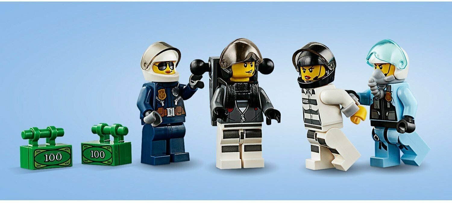 Вступай в ряды Воздушной полиции LEGO City и попади в самую гущу стремительно развивающихся событий! Посмотрите, что это за красная точка в небе?Это воришка, спускающийся на парашюте туда, где в багги его ждёт сообщник.Запрыгивай в скоростной полицейский самолёт, взлетай и опусти крюк, чтобы поймать его, прежде чем он ускользнёт, а твой напарник на мотоцикле пусть отправляется в погоню за багги!