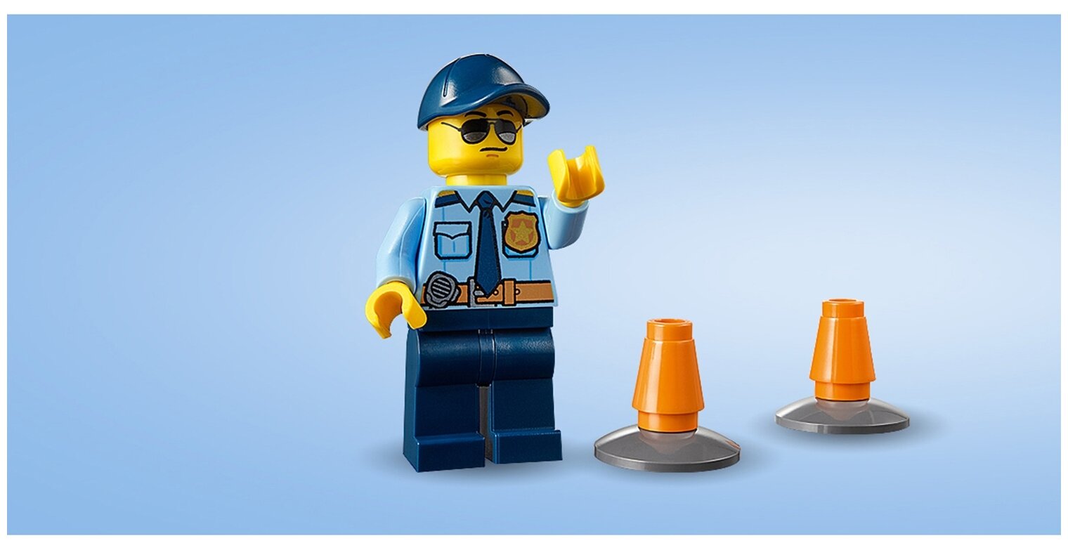 Заводи мощный Автомобиль полицейского патруля и защищай город! Посмотри, кажется, офицеру полиции нужно помочь регулировать движение на этой дороге. Установи сигнальные дорожные конусы и каждый день становись героем полиции города LEGO® City!Следи за порядком на улицах LEGO® City на этом «Автомобиле полицейского патруля» LEGO® City (60239) со съемной крышей, кабиной для минифигурок и узнаваемыми декоративными элементами, а также двумя дорожными конусами и минифигуркой полицейского. В набор входит минифигурка полицейского LEGO®.