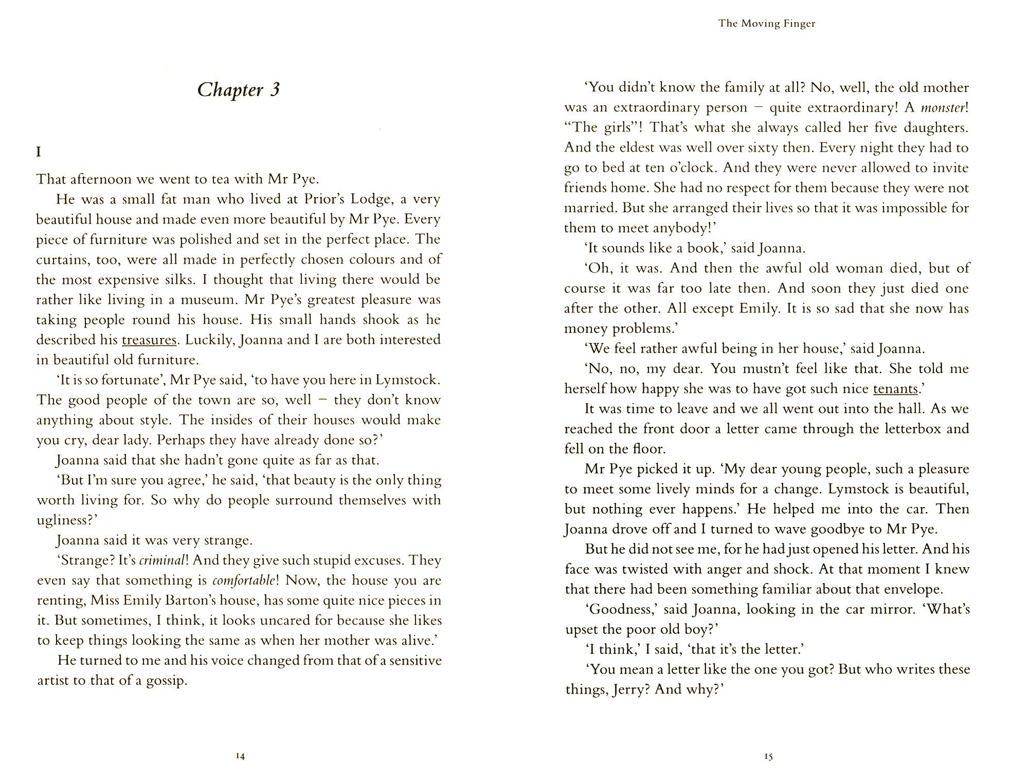 Collins English Readers - серия знаменитого английского издательства "HarperCollins Publishers", которая была разработана для того, чтобы помочь улучшить уровень знания английского языка людям, которые не являются его носителями. Представленная книга - это роман королевы английского детектива Агаты Кристи "Движущийся палец" или "Каникулы в Лимстоке". Это произведение является частью серии детективных расследований о пожилой леди-детективе-любителе мисс Джейн Марпл, которая живет в маленькой деревушке Сент-Мэри-Мид. В этот раз мисс Марпл помогает решить жестокое преступление в небольшом городке Лимсток. Дело об убийстве пытается распутать ветеран одной из Мировых воен, но дела очень загадочное и его распутывает только опытная мисс Марпл - человек, который хорошо разбирается в человеческой натуре. Эта книга дополнена хорошим словариком, но не с переводом слов, с их толковым значением английском, но с простым объяснением. Также следует помнить, это адаптированный текст романа и в нем есть сокращения. Как тренажер по чтению книг на английском - это прекрасное пособие для всех, кто волнуется об уровне знания своего языка. Надеюсь, что Вам понравится этот роман!