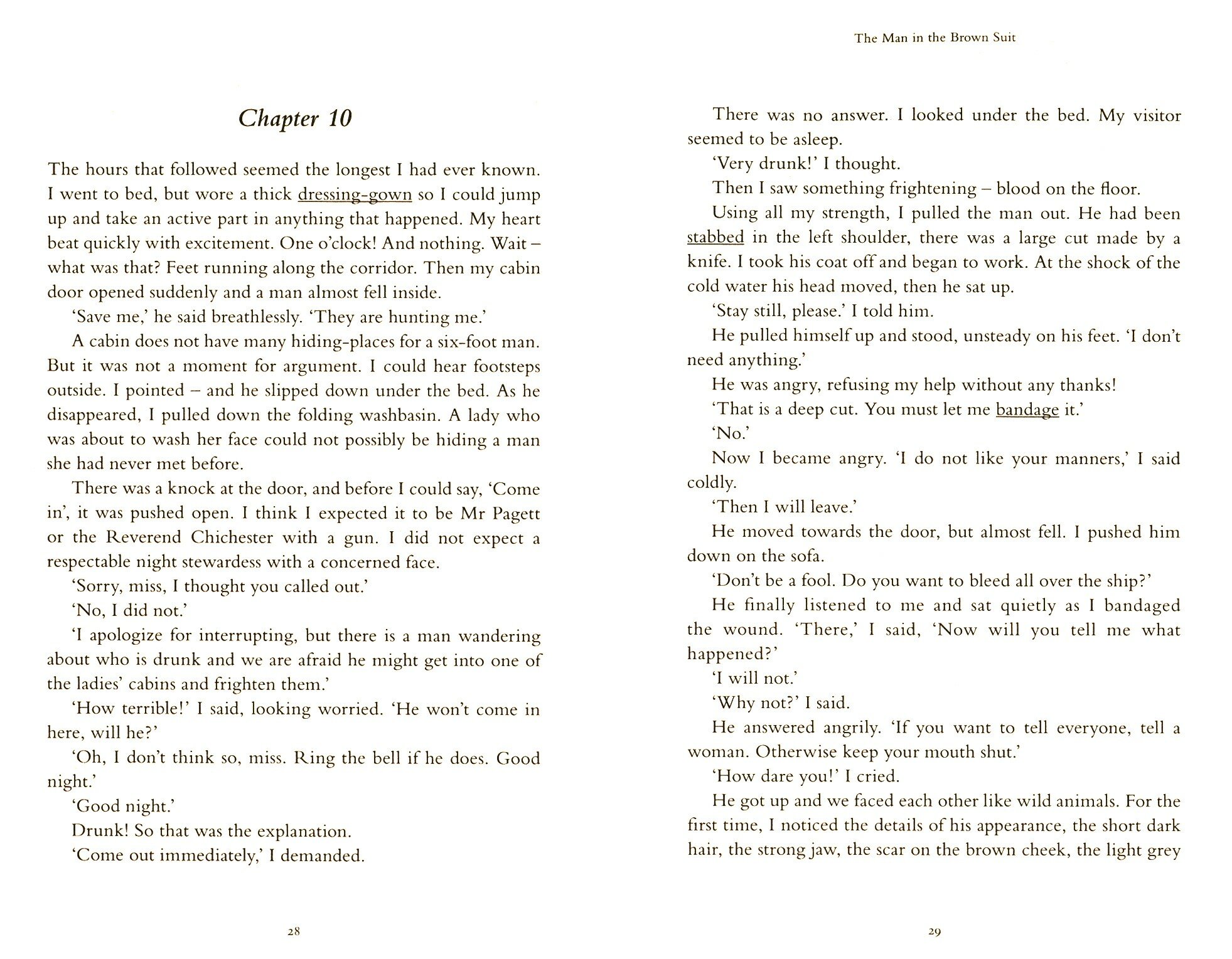 Мне очень понравилась книга "Человек в коричневом костюме" - это внесерийный роман знаменитой английской писательницы Агаты Кристи. Это снова детективная история, в которой случайная женщина становится свидетелем преступления, которая сама пытается разгадать. Единственная зацепка, чтобы понять, кто преступник, так это то,что он носит коричневый костюм. Главной герои придётся провести время в путешествии по океану из Англии в Южную Америку, В Кейптаун, куда плывет и сам преступник. Эта серия книг предназначена для людей владеющих языком В2 или В2+, то есть это книги со сложностью текста книги среднего уровня или выше среднего. Но эта книга читается очень легко и весь материал понятен. Даже, если и попадаются незнакомые новые слова, то их значение можно найти в прилагающемся в конце книги словарике или культурологических пояснениях. Нужно заметить, что текст самого произведения изложен на ста страницах, а остальные двадцать - это словарик, пояснения и аннотация к другим книгам серии. Поэтому события описанные в книге очень бурно развиваются, очень мало описаний местности и людей. Но книга эта очень достойная для прочтения, как тренировка к чтению уже неадаптированных книг на английском языке.