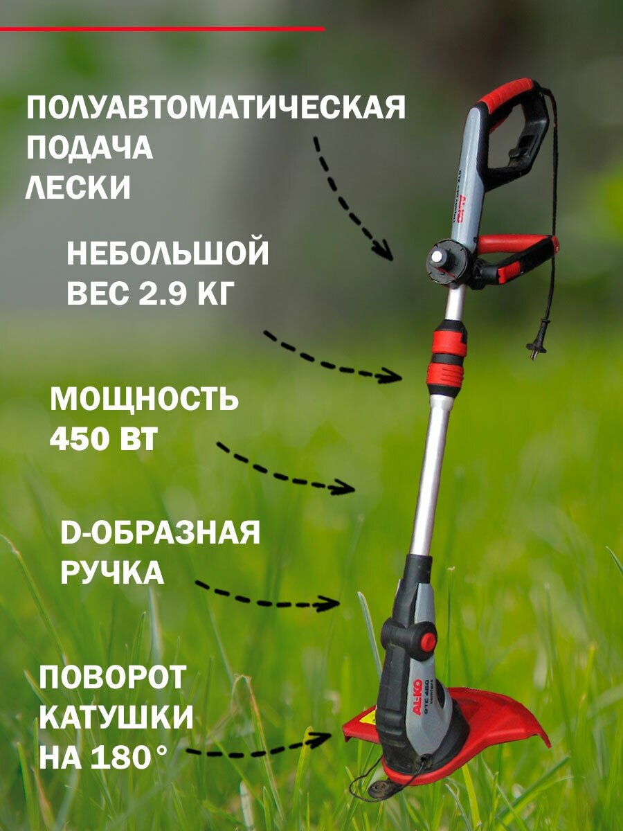 Электротриммер Al-Ko – это незаменимый помощник в уходе за газонами. Его можно использовать как вместо газонокосилки (на небольших участках), так и в дополнение к ней для подравнивания травы под садовыми дорожками, вдоль стен домов и заборов. Благодаря удобной поворотной и наклоняемой режущей головке триммер удобен для обработки кромок. Триммер работает от надежного электрического двигателя мощностью 450 Вт, обеспечивая достаточную для бытового использования производительность.