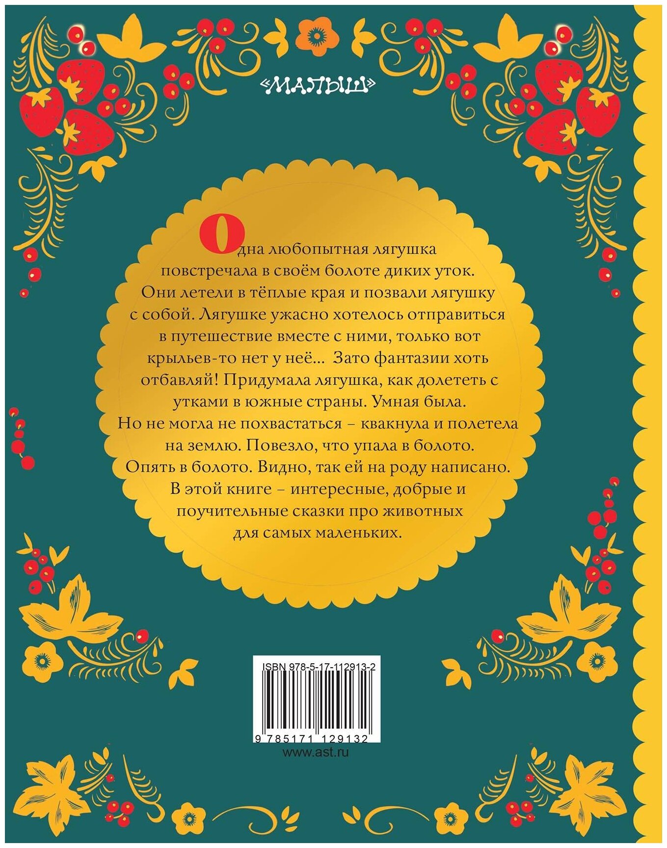Книга «Лягушка-путешественница» — это сборник интересных и поучительных сказок В. М. Гаршина, Д. Н. Мамина-Сибиряка и Л. Пантелеева про животных, которые оказываются в самых непростых ситуациях. Лягушка-путешественница отправляется в путешествие с дикими утками, бедная уточка из-за поломанного крыла остаётся один на один с хитрой лисой, а две лягушки-подружки попадают в банку со сметаной. Эти сказки объясняют детям, что такое упорство, находчивость, смелость.Для детей до 3-х лет.